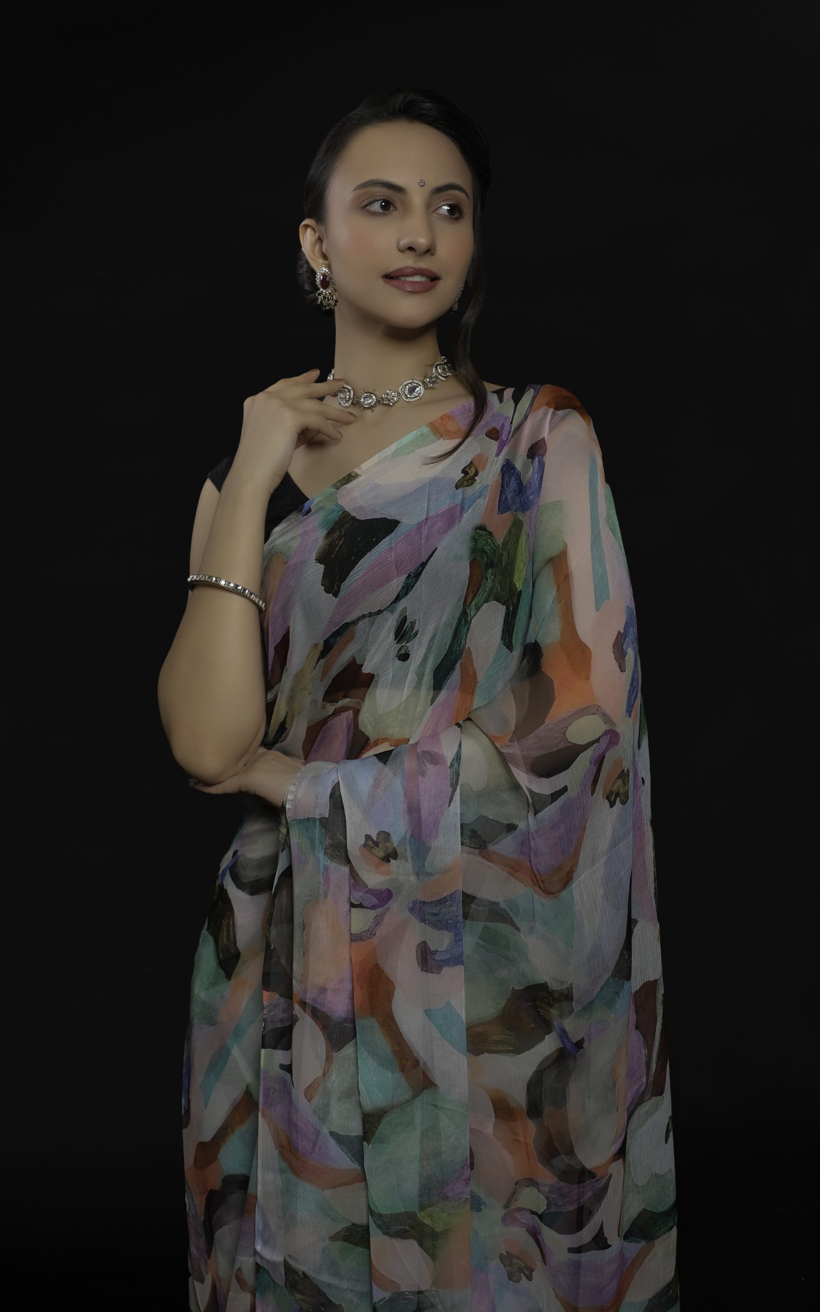 "Soft whispers of love, wrapped in Digidrapes` Dreams Come True Pure Chiffon Saree. Elegance dances, as delicate folds weave a tale of romance and timeless beauty. Our models shines in Chiffon Saree.