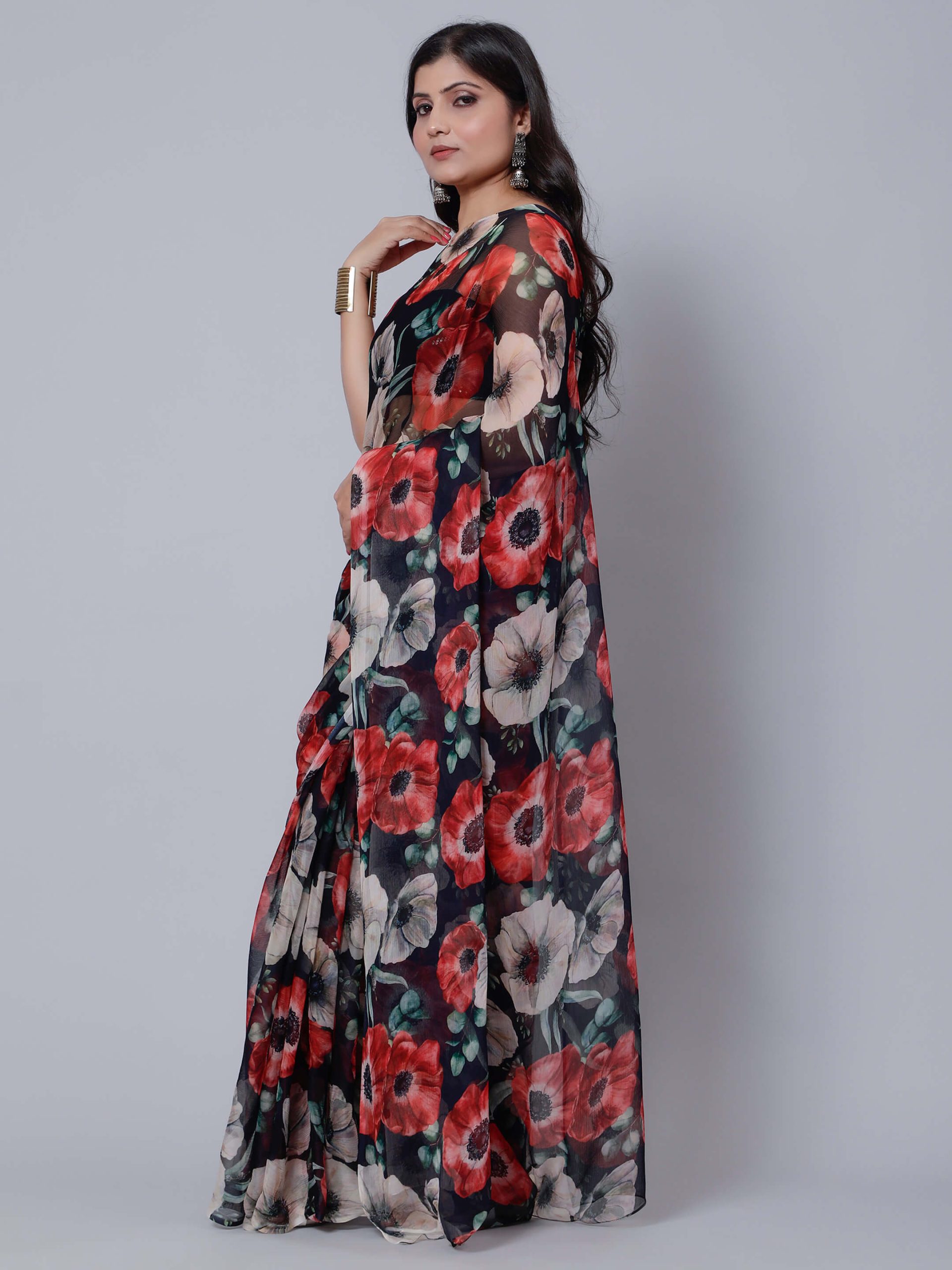 The Blooming Tulips Chiffon Saree features a stunning tulip floral print that brings a fresh and vibrant look to your wardrobe. Crafted from premium Chiffon fabric, this saree is lightweight, breathable, and soft, making it perfect for parties, casual gatherings, or any festive occasion.