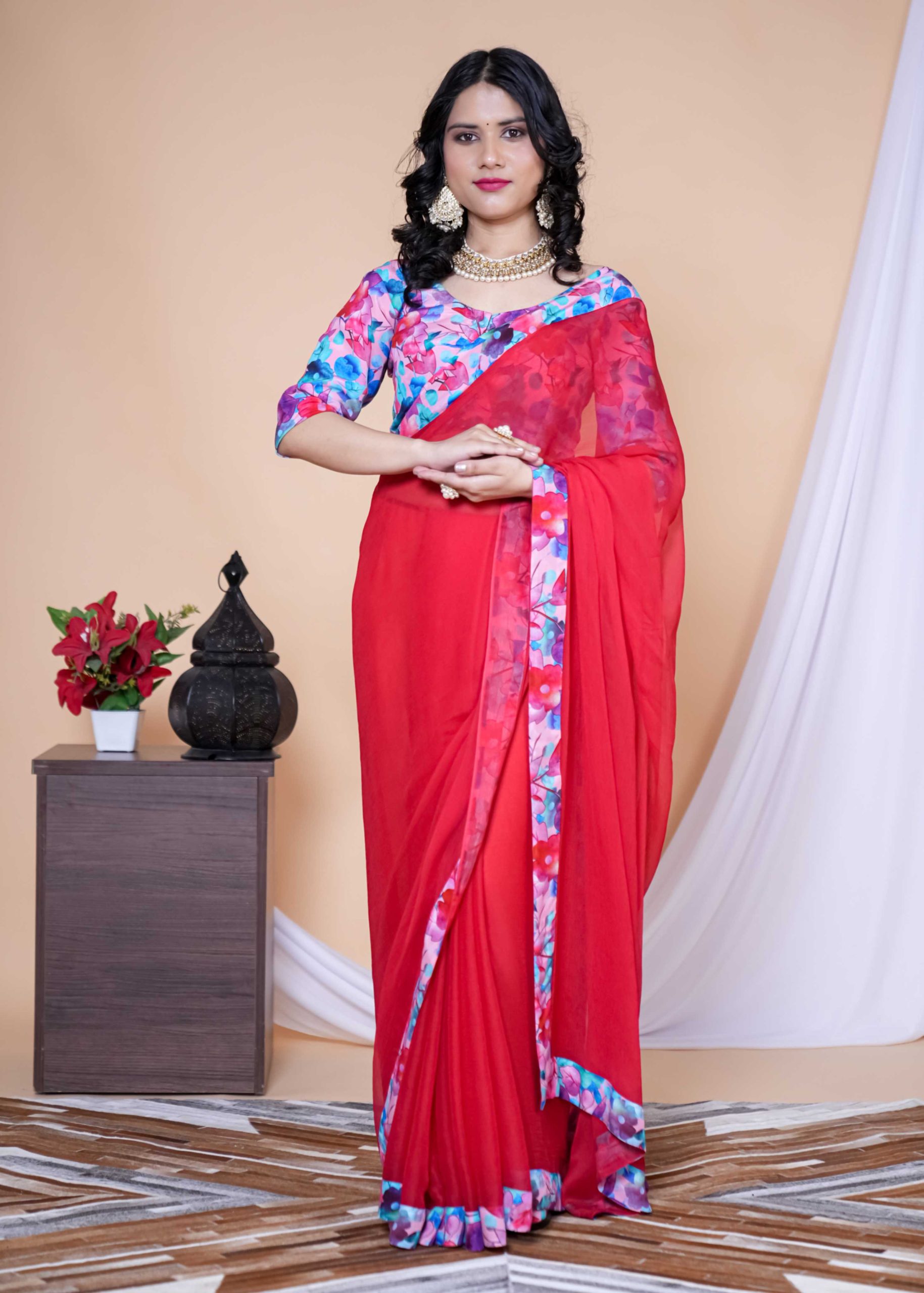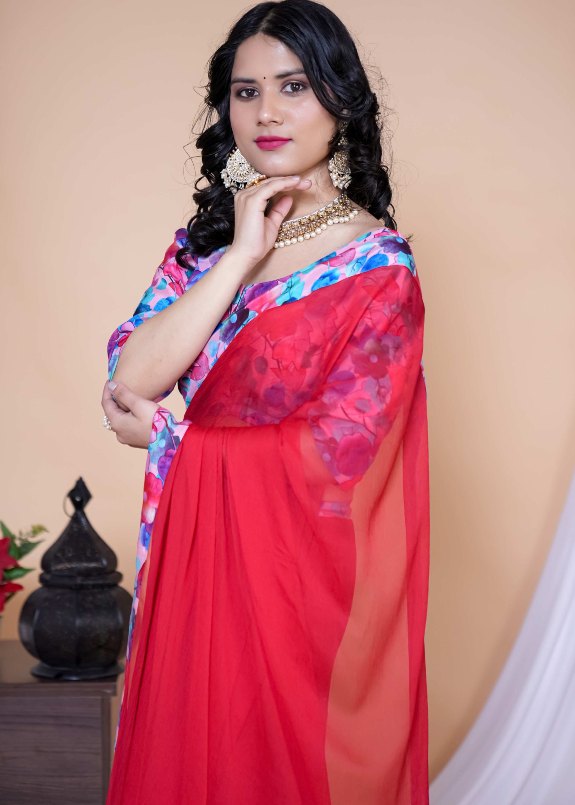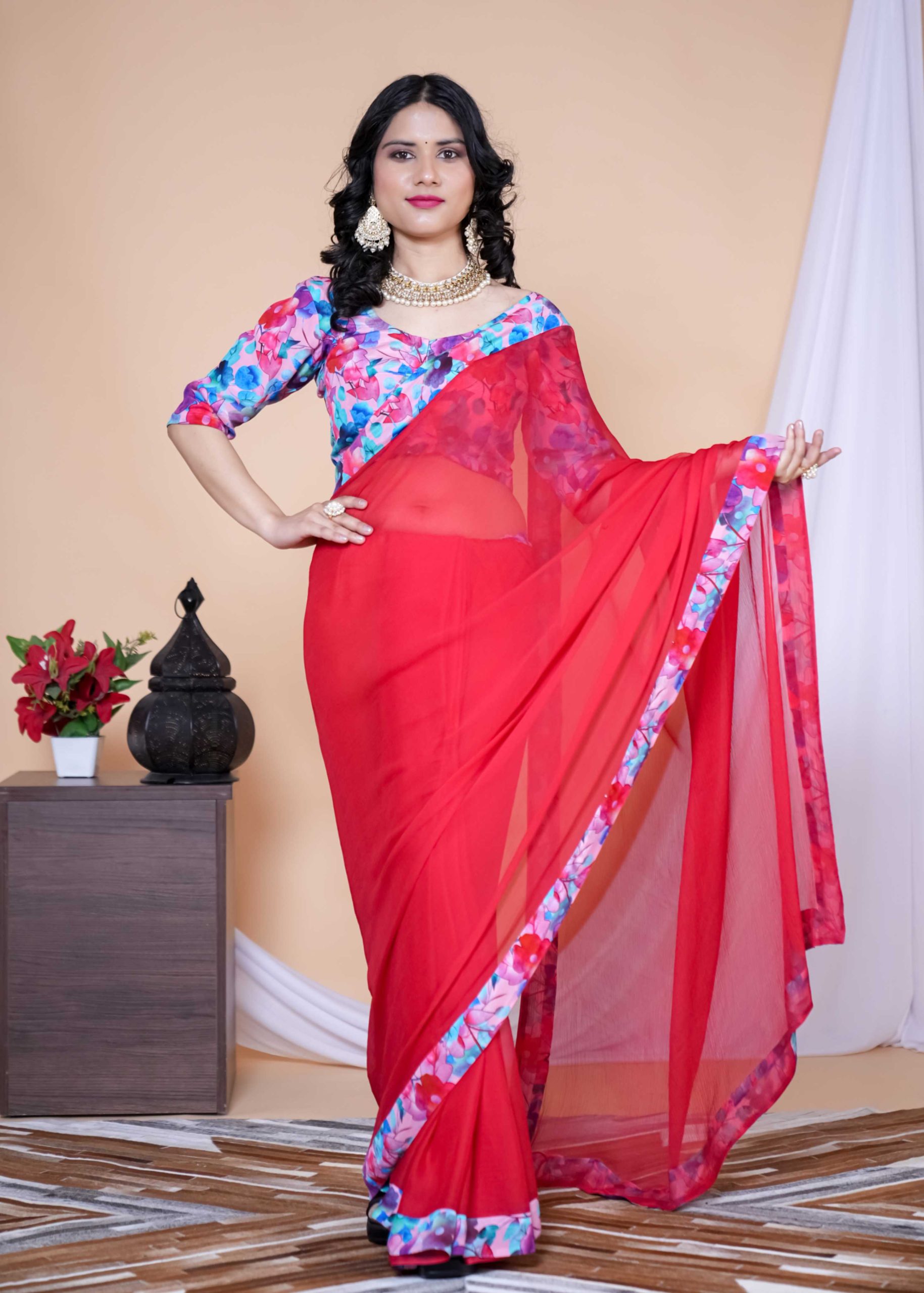 Our Red & Pink Shade Floral Chiffon Saree is the ultimate statement for brunch dates, haldi hugs, and every “wow” moment in between.