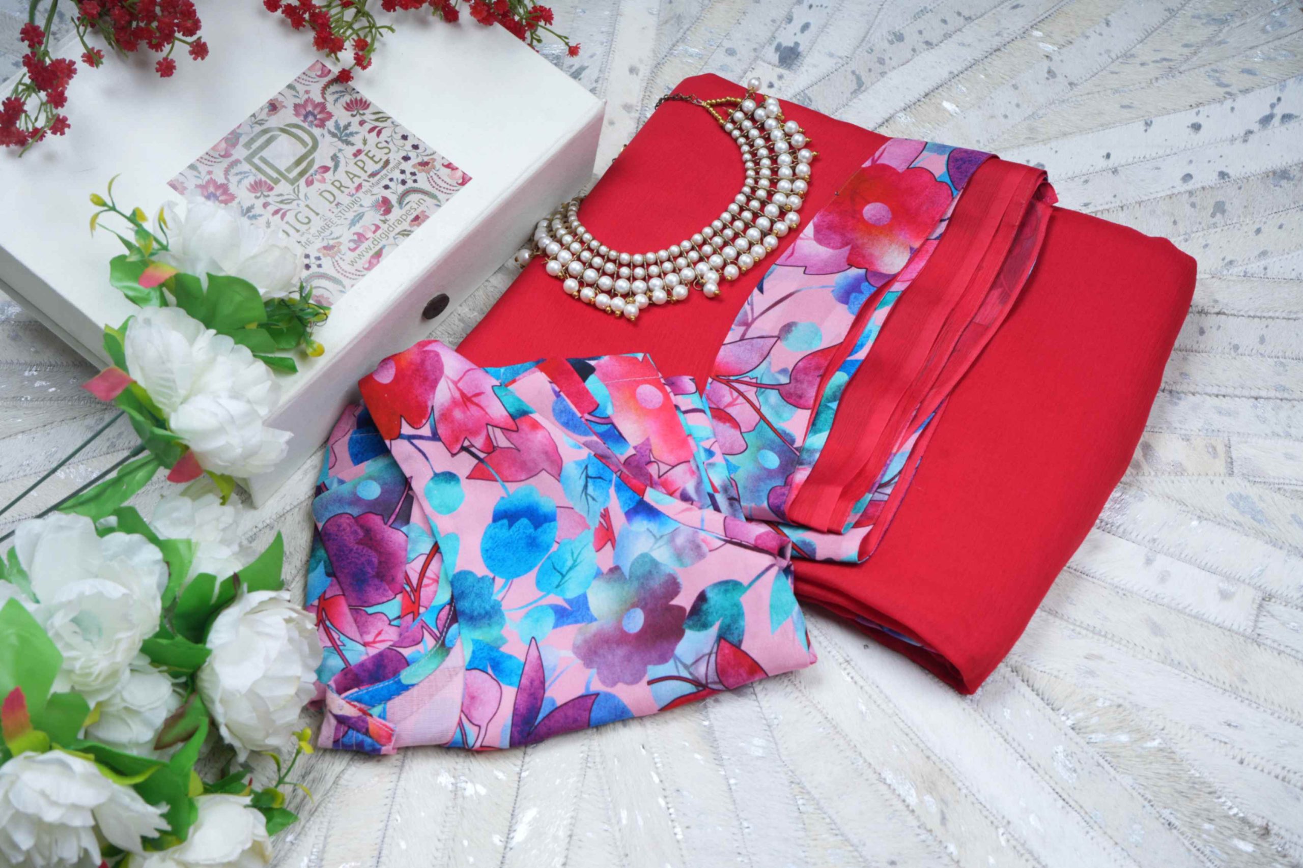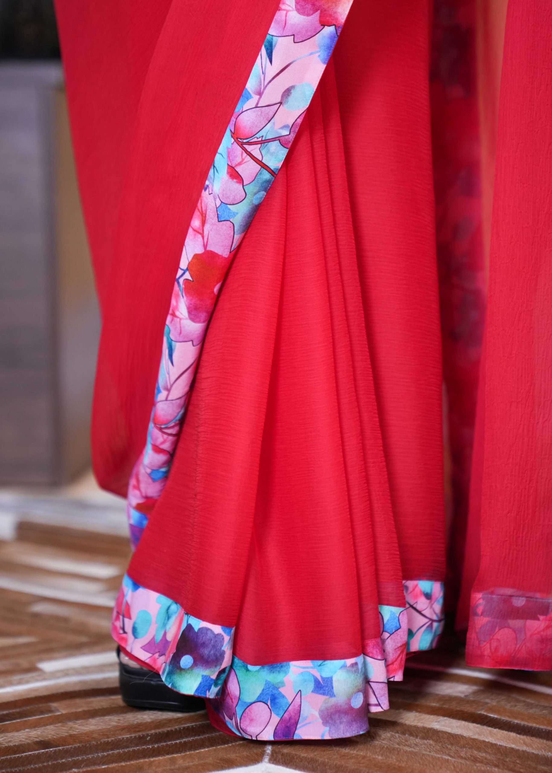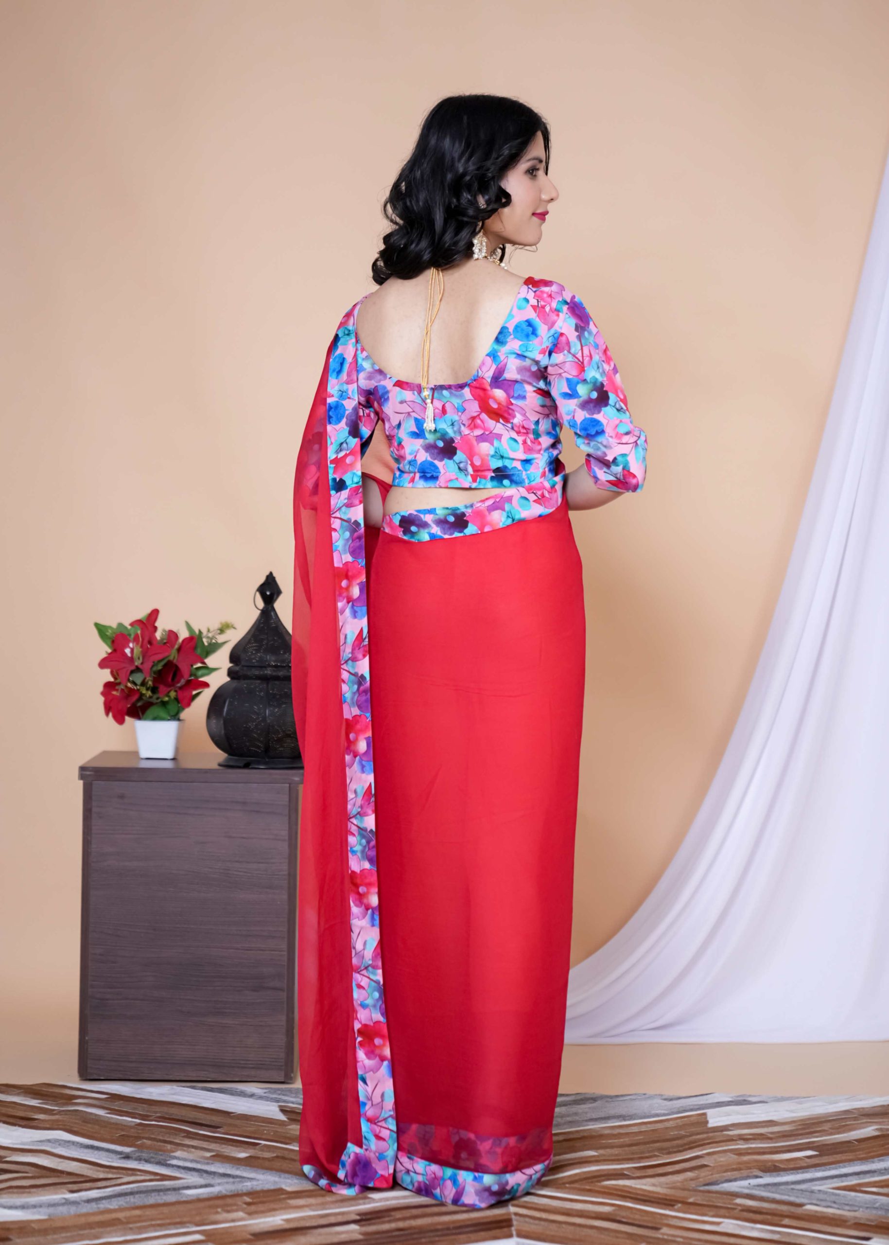 Our Red & Pink Shade Floral Chiffon Saree is the ultimate statement for brunch dates, haldi hugs, and every “wow” moment in between.