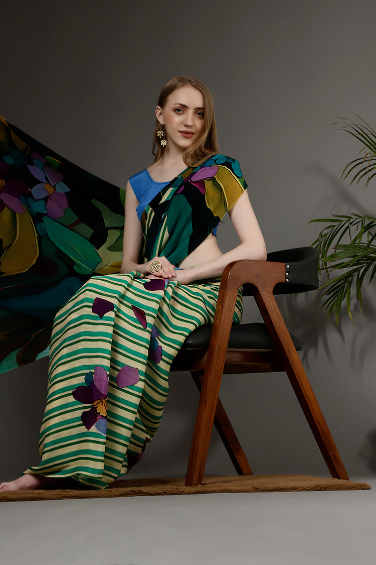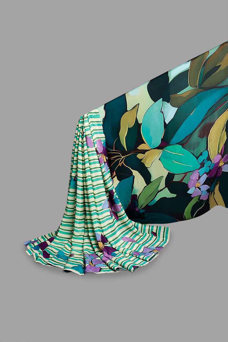 The Digital Extravaganza Silk Crepe Saree is a masterpiece featuring vibrant digital prints on luxurious silk crepe fabric. This saree combines modern aesthetics with traditional elegance, making it ideal for weddings, festive celebrations, or grand parties. The lightweight and soft texture ensures a comfortable and graceful drape.