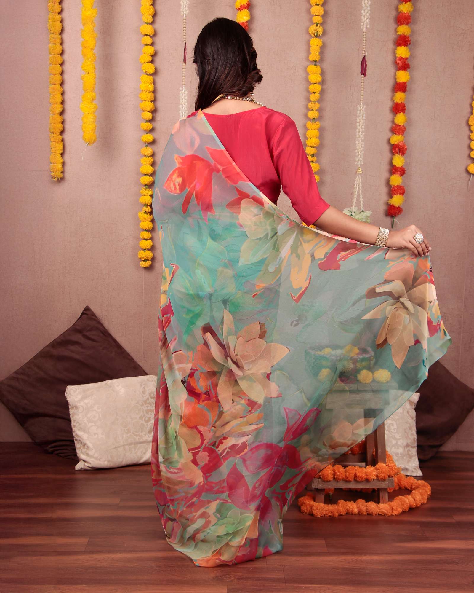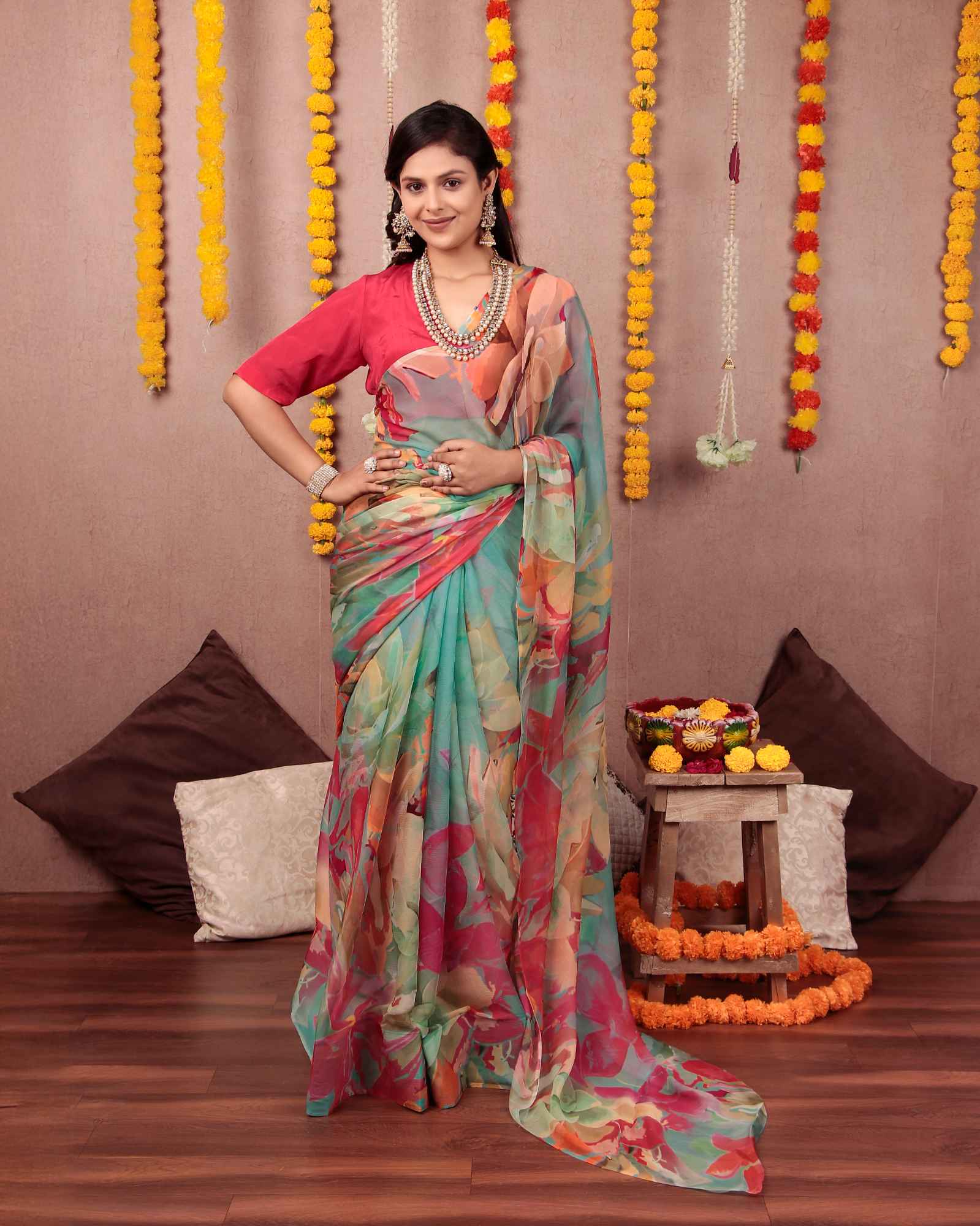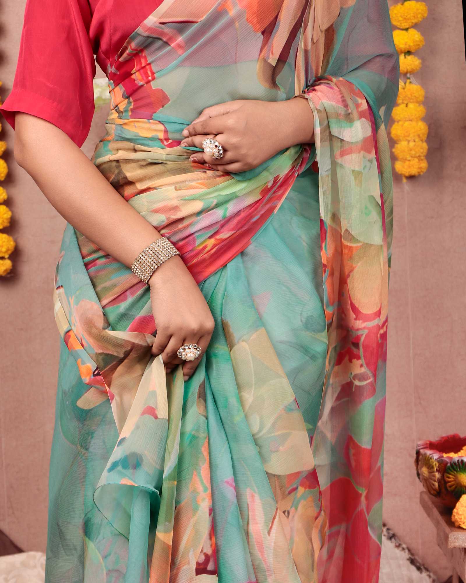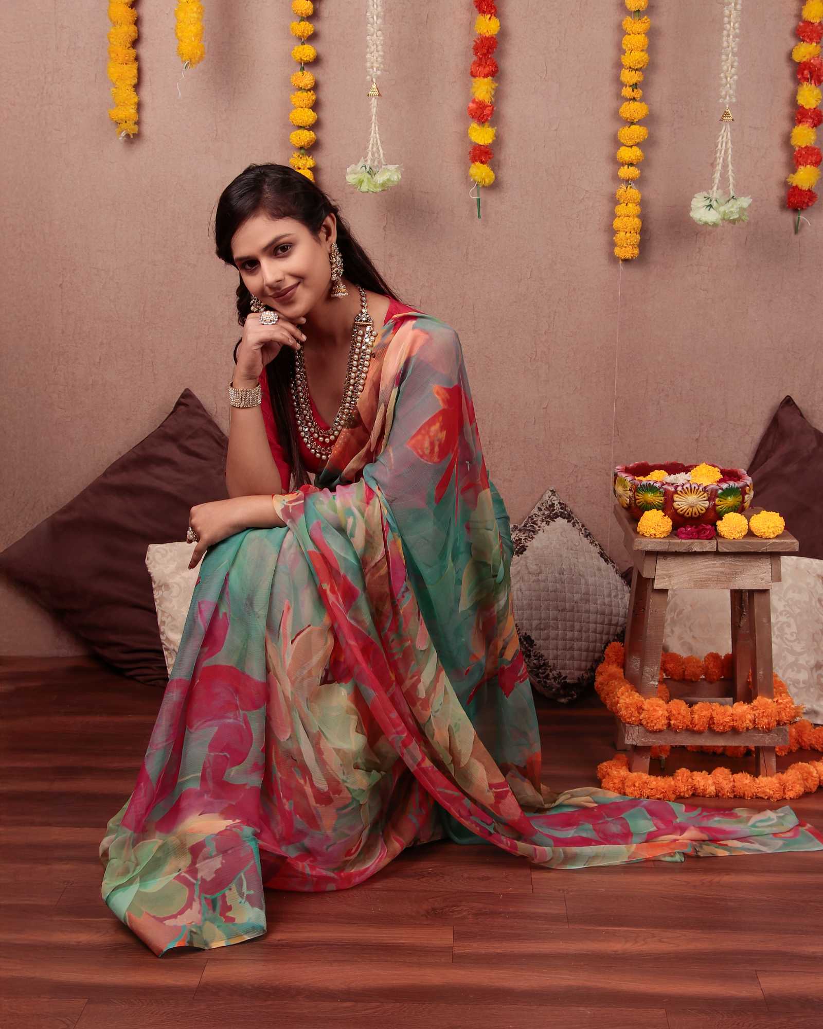 Our Red & Pink Shade Floral Chiffon Saree is the ultimate statement for brunch dates, haldi hugs, and every “wow” moment in between.