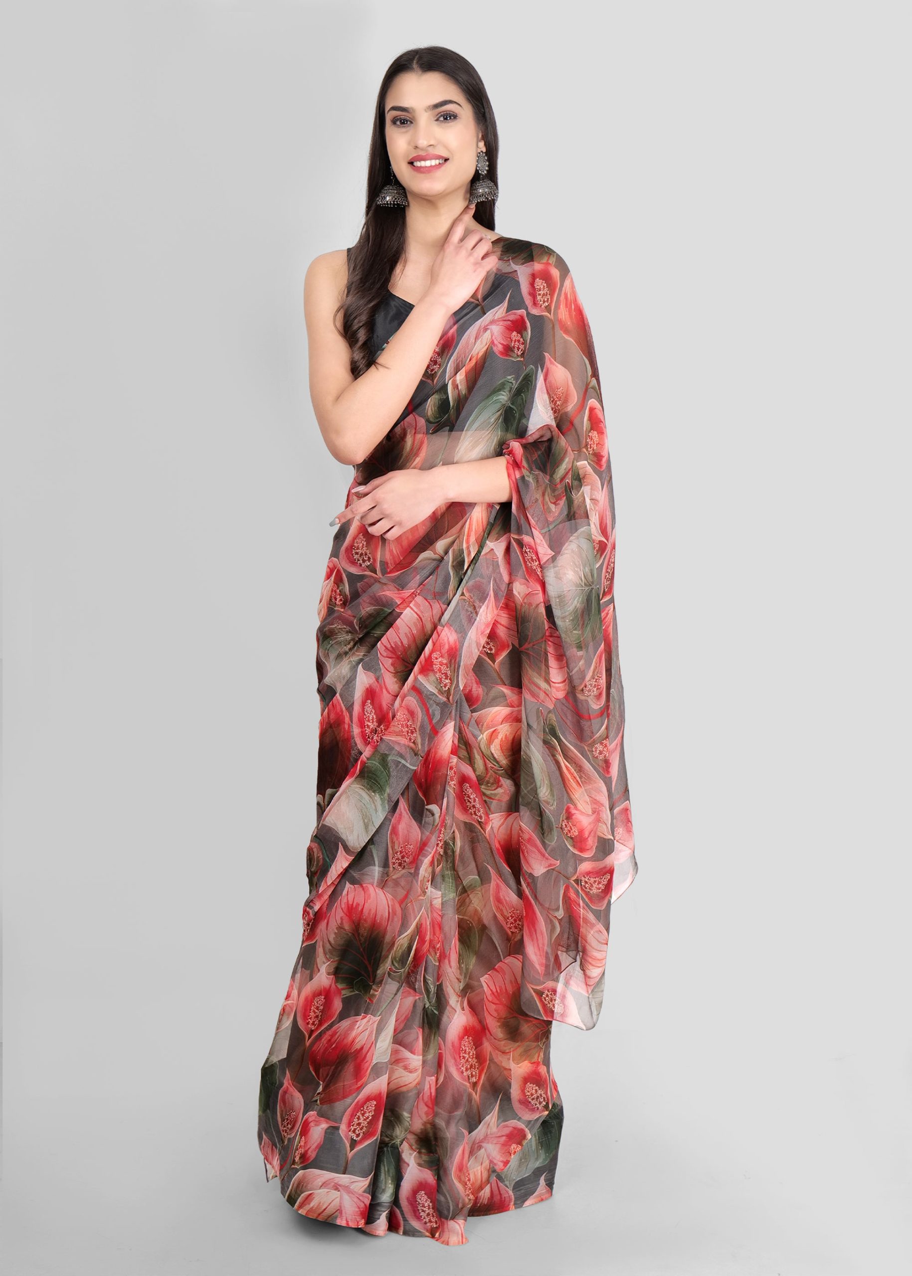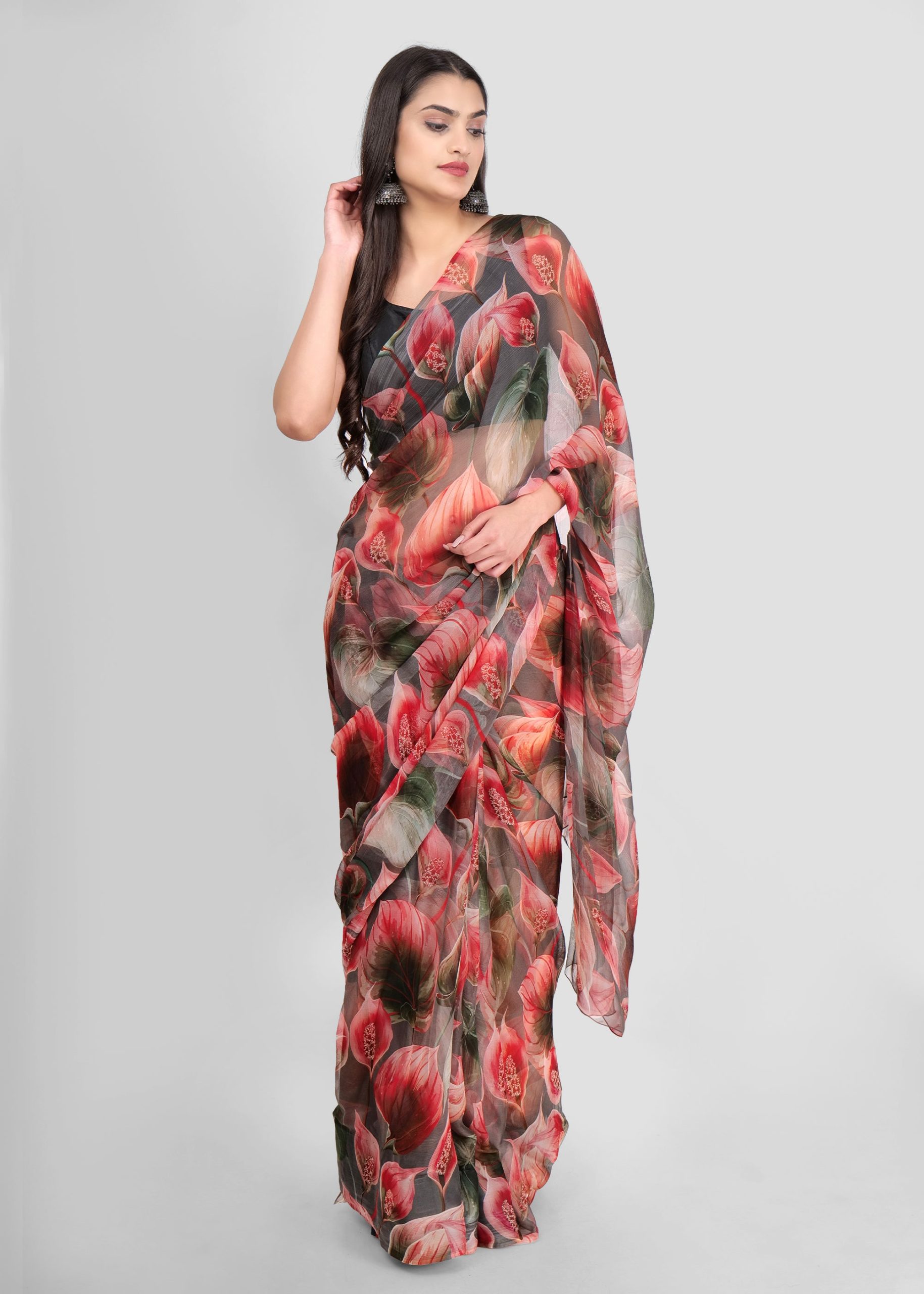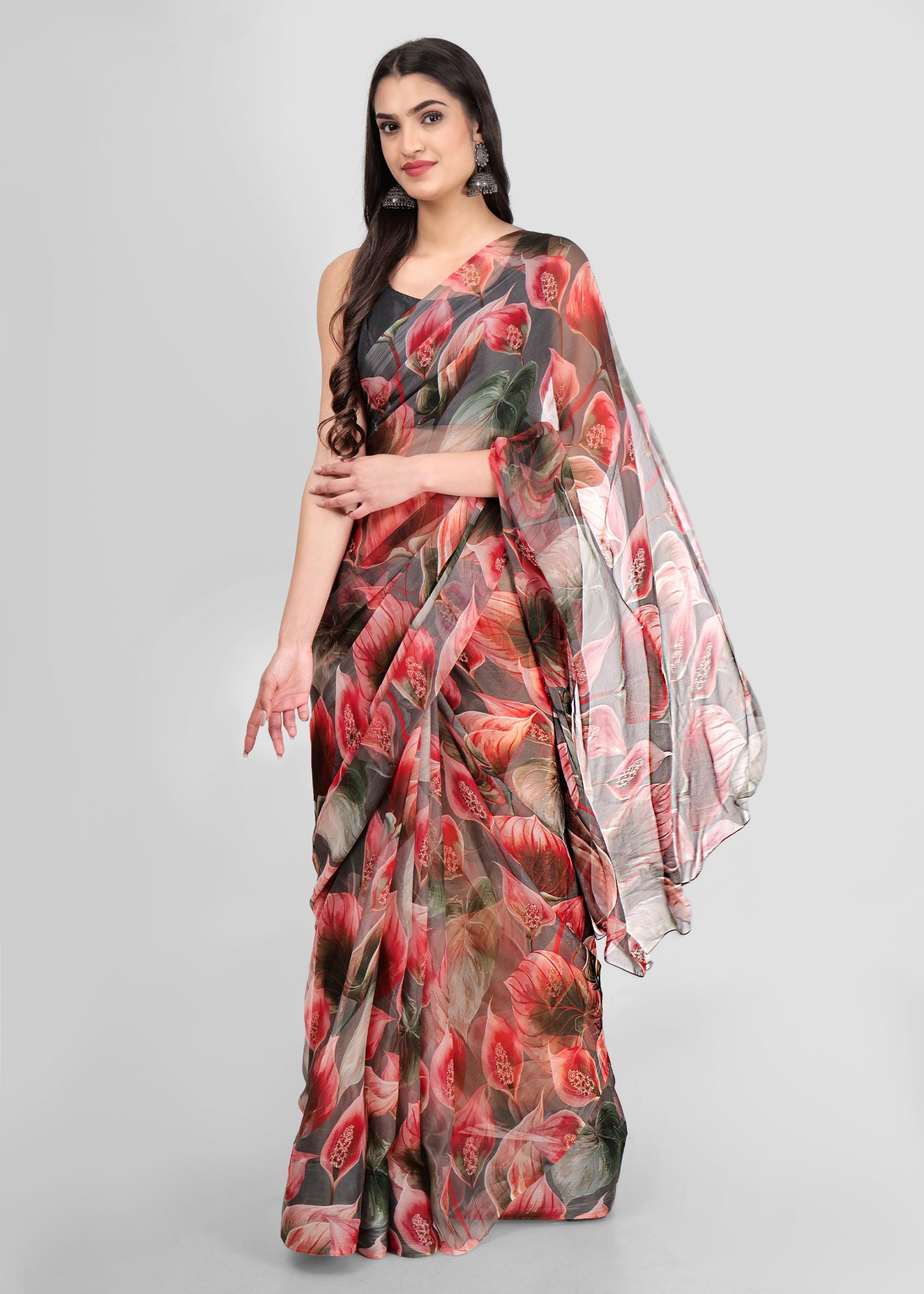 The Fiery Flamenco: Red Chiffon Saree is a striking choice for those looking to make a bold statement. Crafted from luxurious red chiffon fabric, it offers a lightweight and soft feel, while its fiery color exudes passion and elegance. Perfect for weddings, parties, and festive occasions, this saree ensures all eyes are on you.