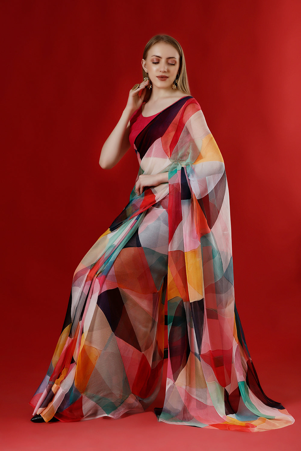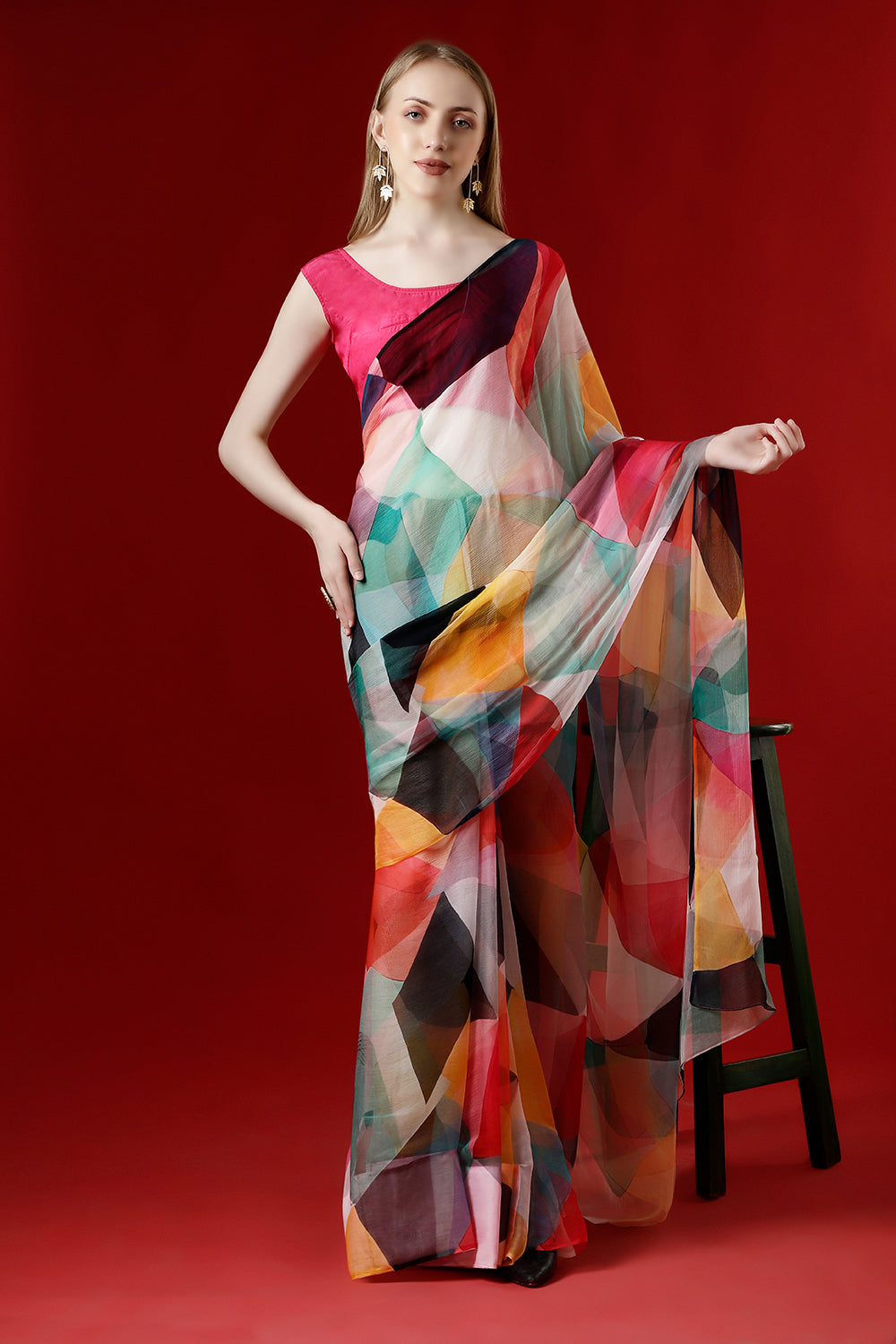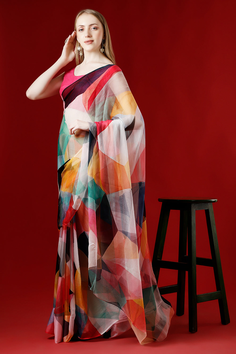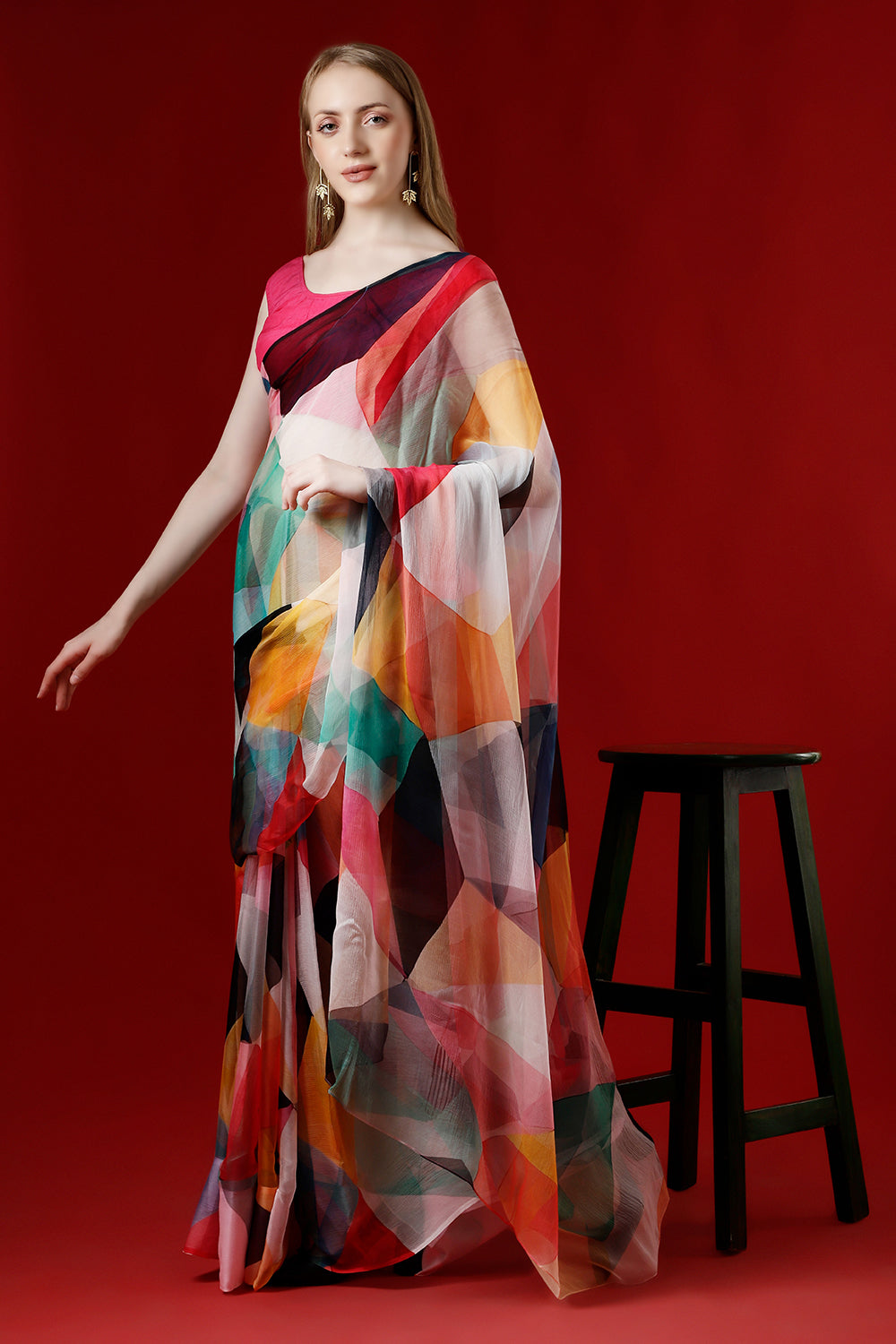 The Geometry of Colours Chiffon Saree blends contemporary geometric patterns with the elegance of soft chiffon fabric. Lightweight and breathable, this saree provides a comfortable drape, making it perfect for parties, weddings, and festive occasions. The vibrant colors and unique design create a stylish and modern look.