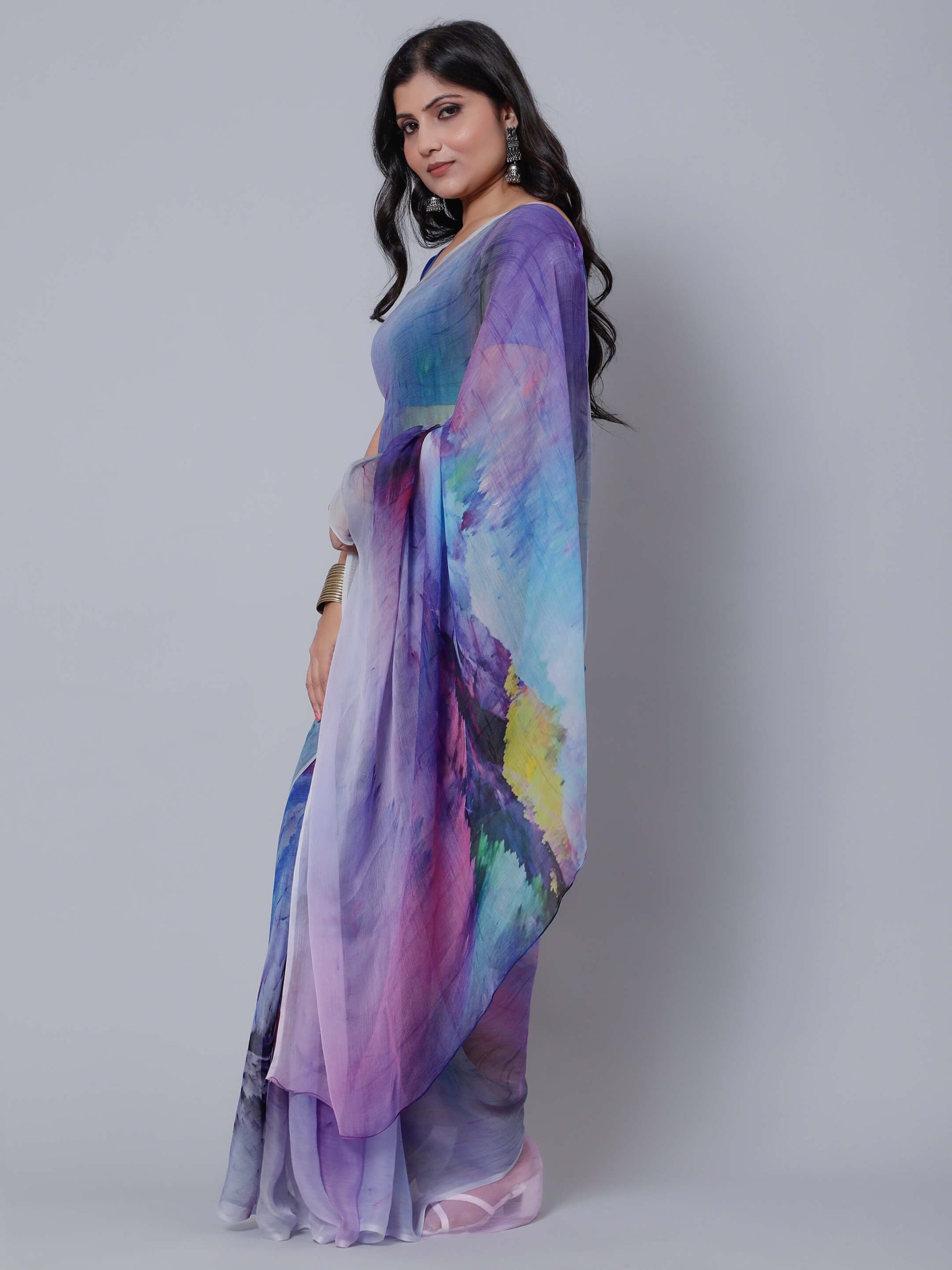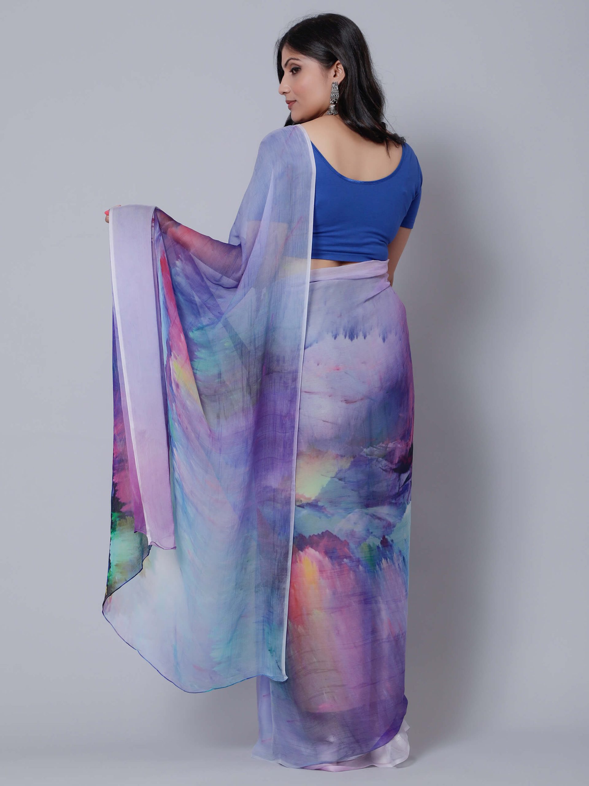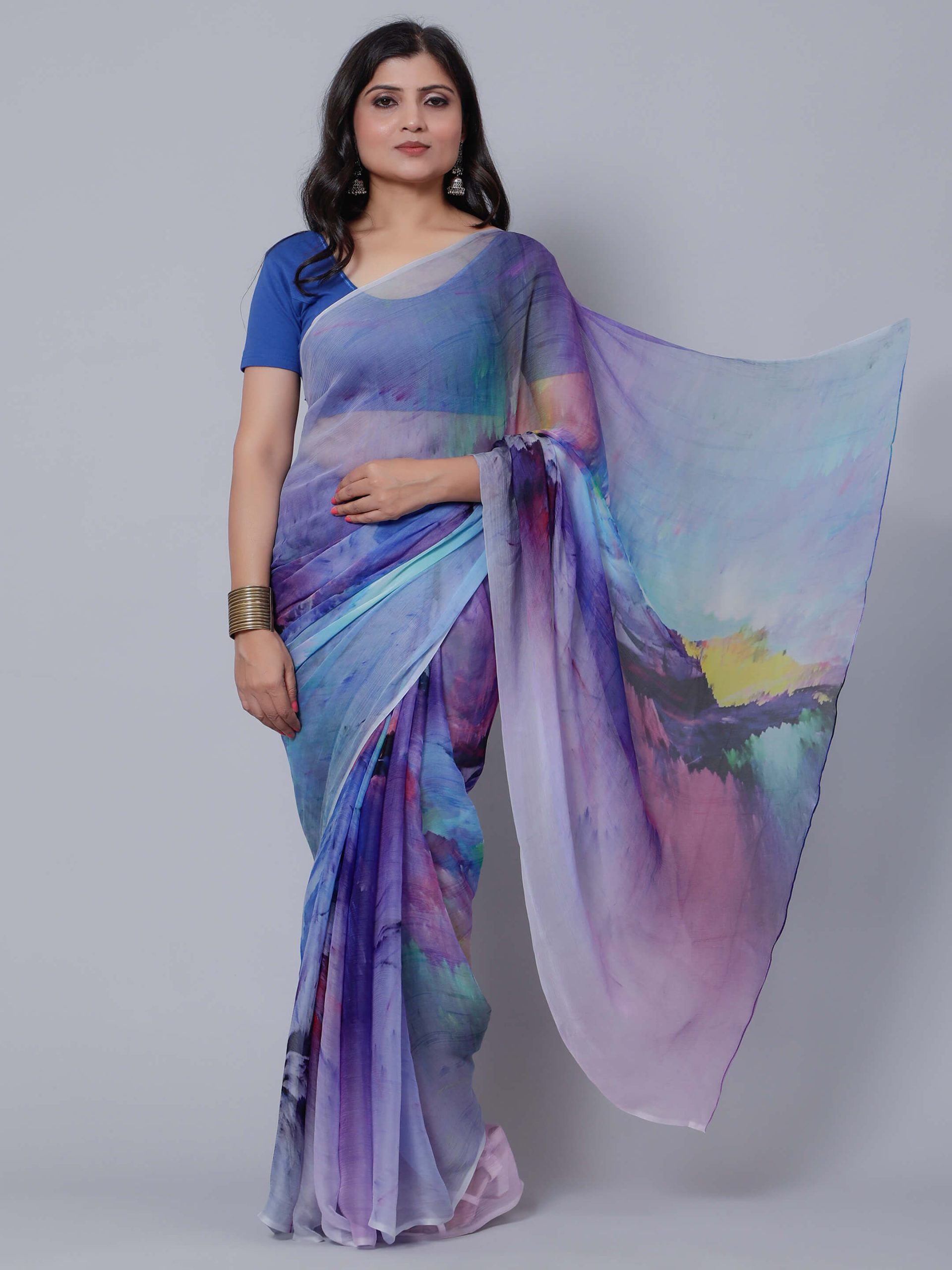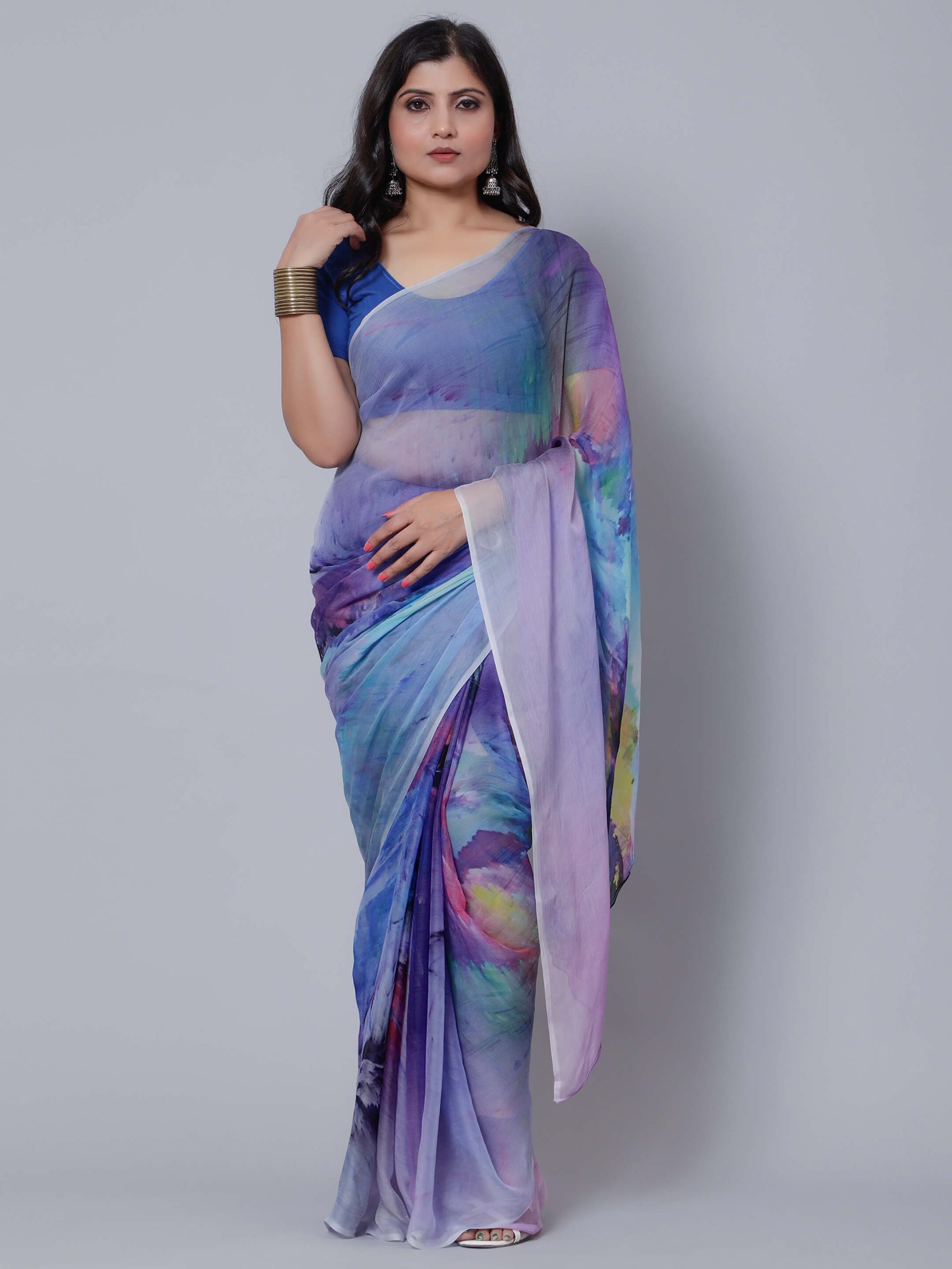 The Hues of Blue Chiffon Saree features a beautiful gradient of blue shades on soft chiffon fabric. Lightweight and breathable, this saree drapes beautifully, making it perfect for weddings, parties, and evening events. The soothing blue tones add a sophisticated and graceful touch to your look.