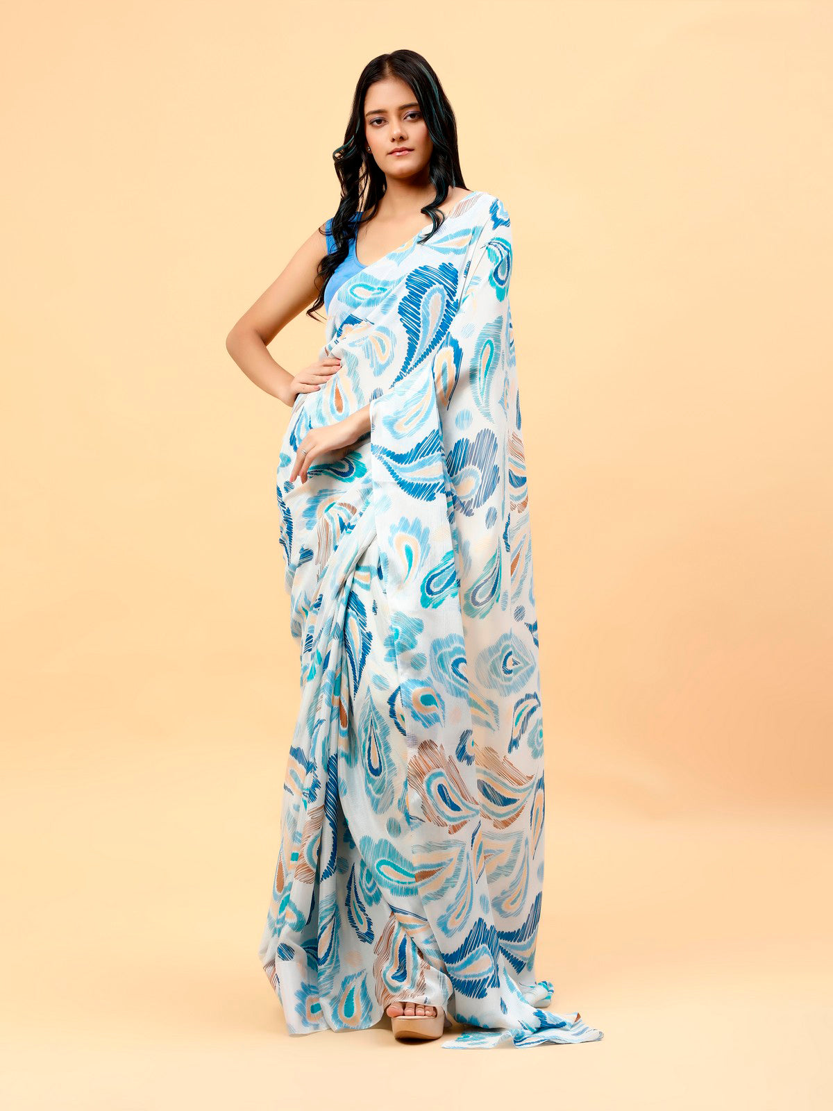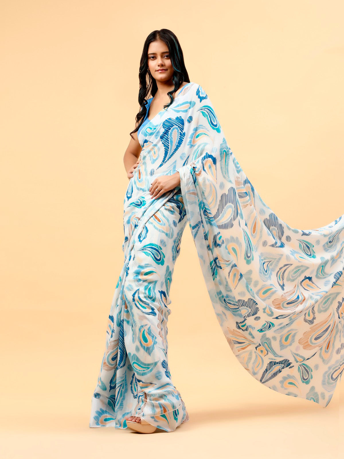 The Paisley in Chinon saree showcases a classic paisley design, crafted from soft and breathable Chinon fabric. This saree drapes gracefully, offering both comfort and style. Ideal for weddings, parties, and festive occasions, it adds an element of timeless elegance to your wardrobe.