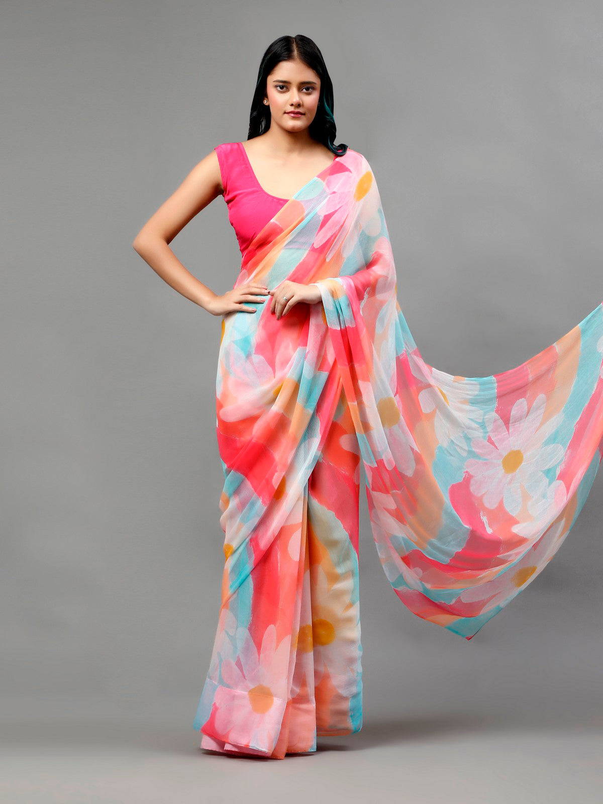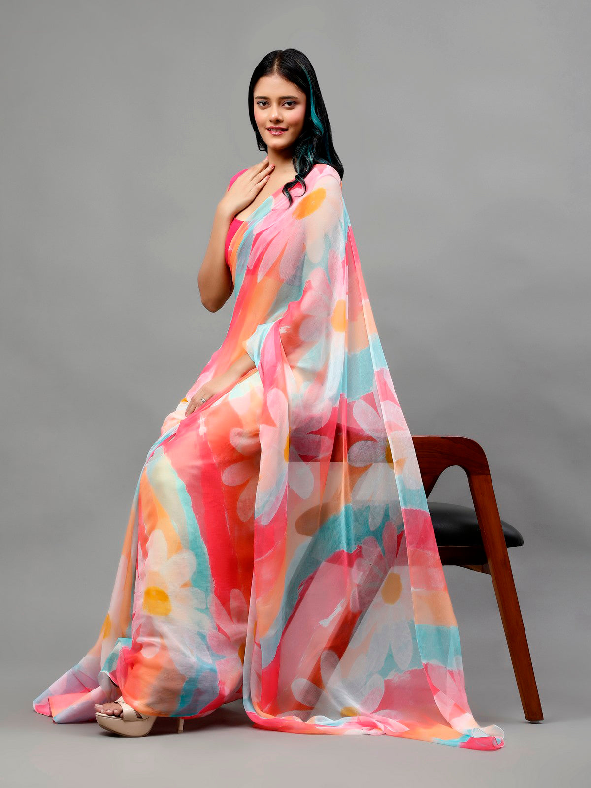Our Red & Pink Shade Floral Chiffon Saree is the ultimate statement for brunch dates, haldi hugs, and every “wow” moment in between.