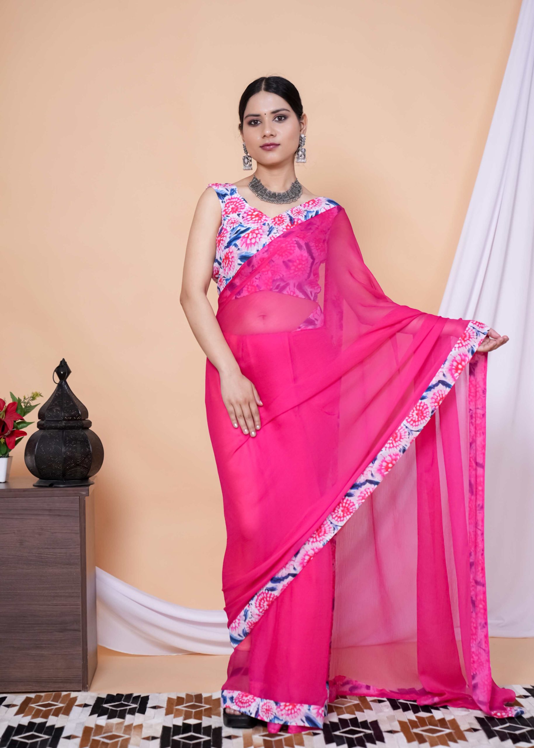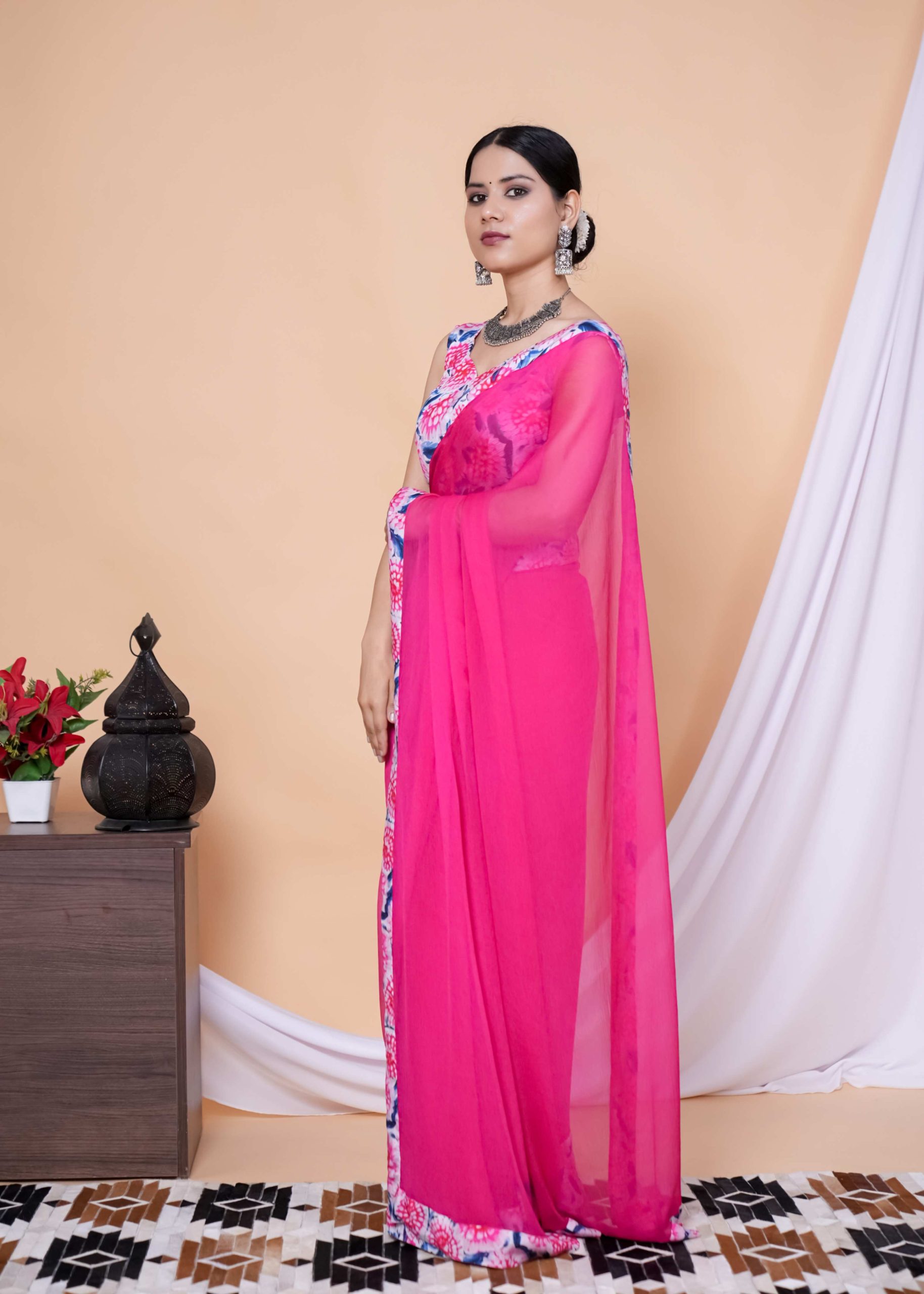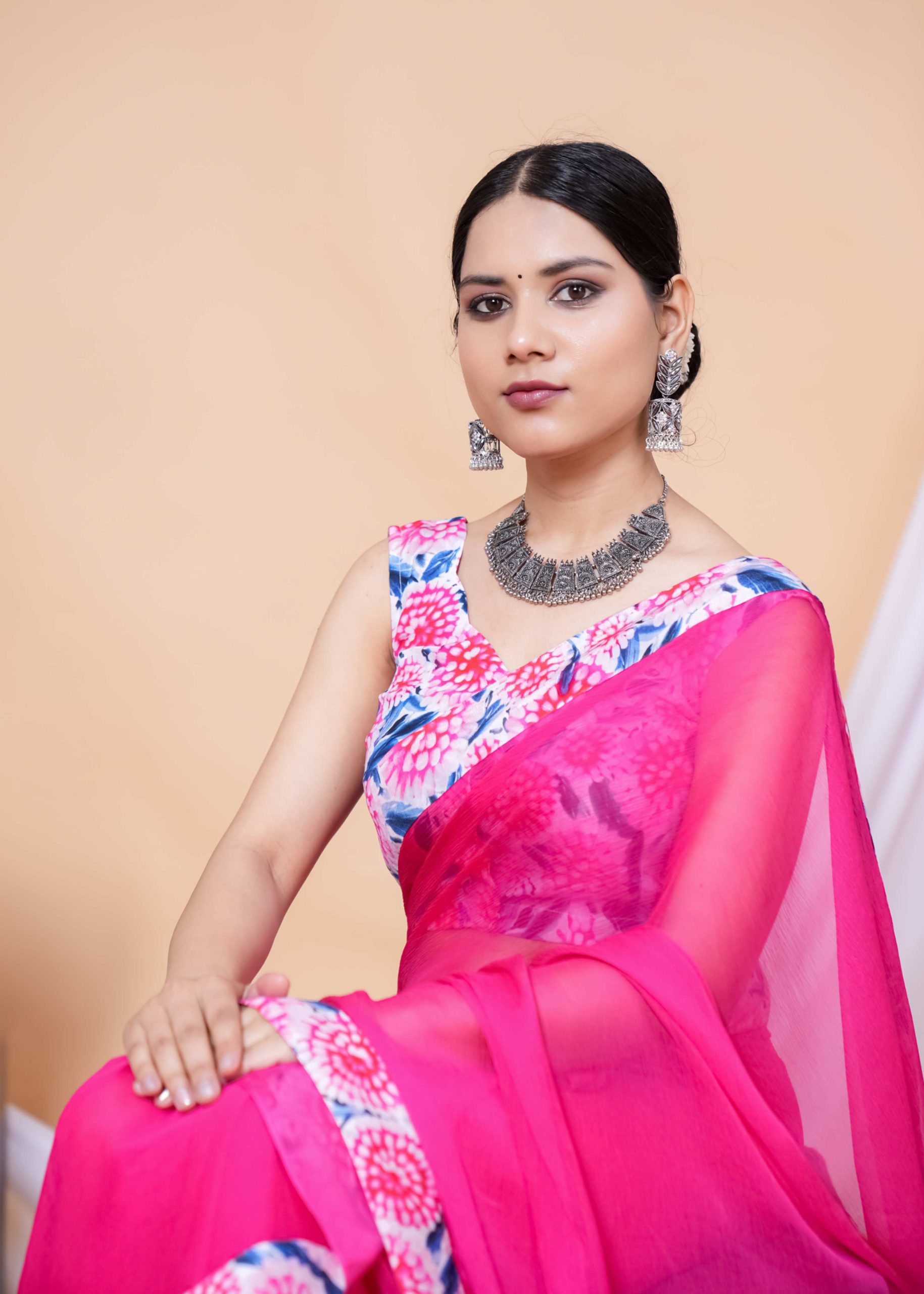 Our Red & Pink Shade Floral Chiffon Saree is the ultimate statement for brunch dates, haldi hugs, and every “wow” moment in between.