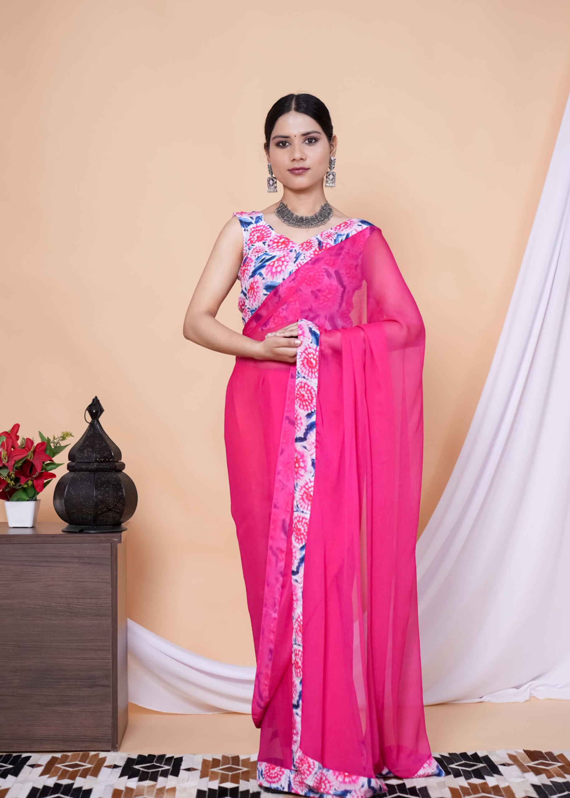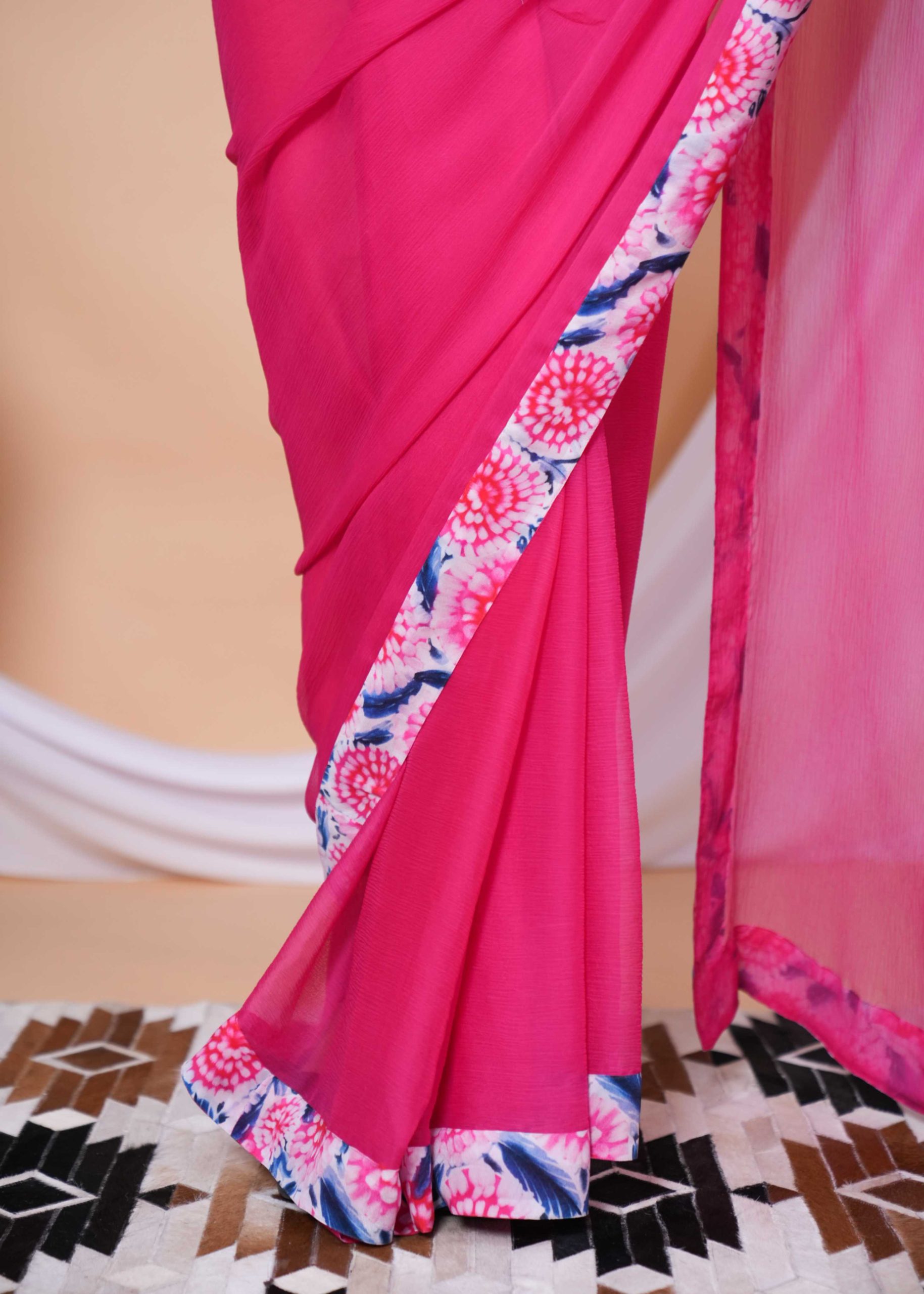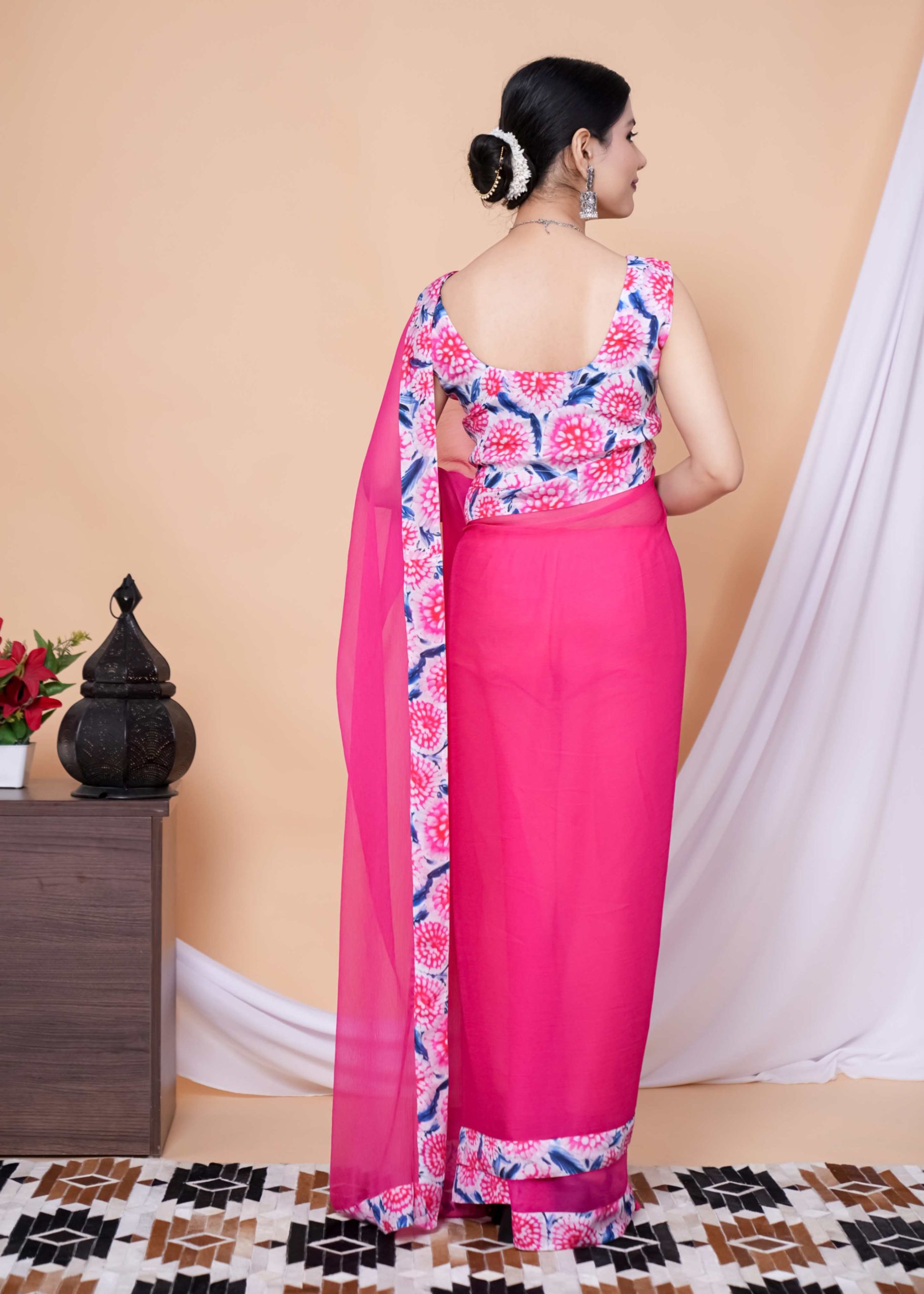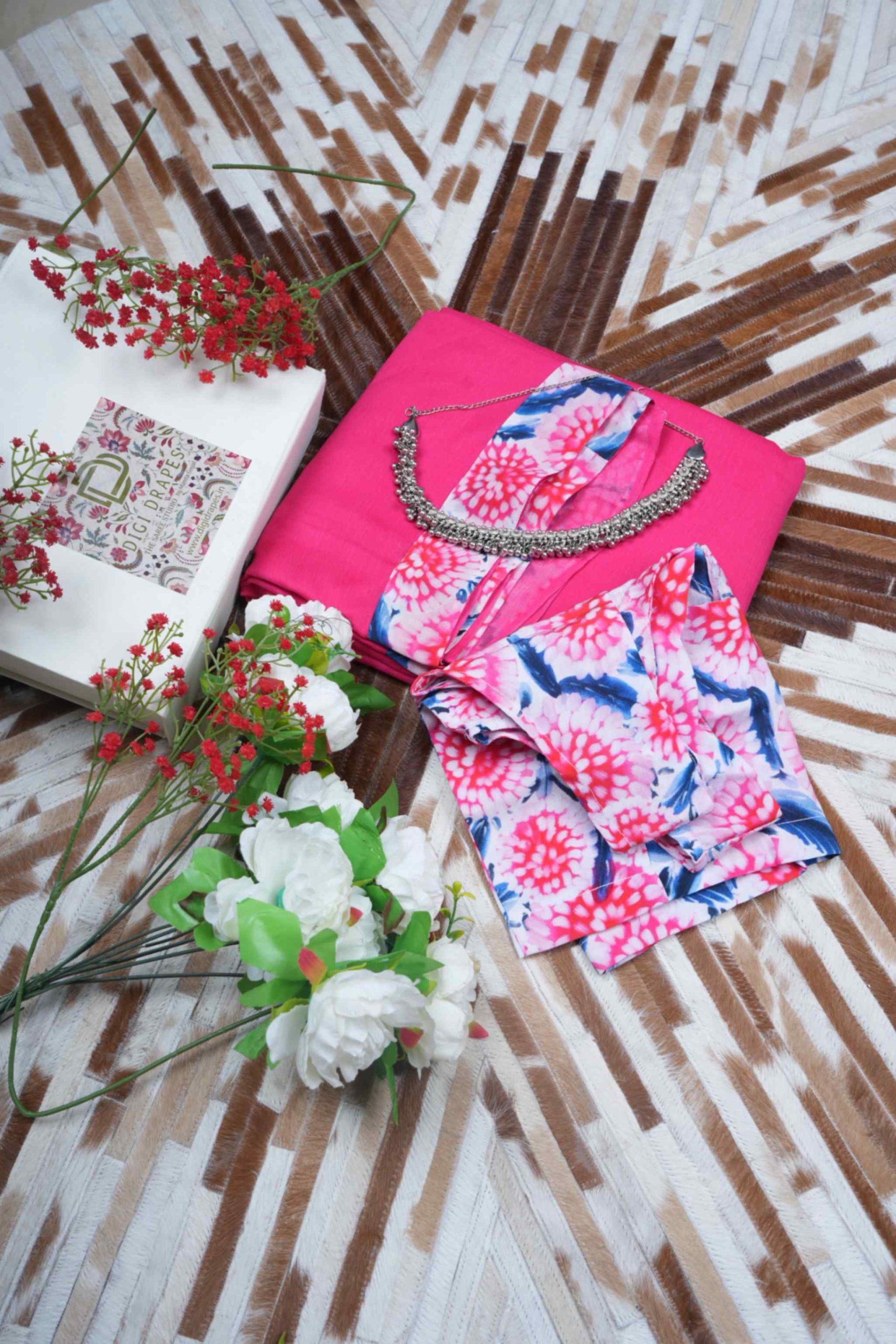 Our Red & Pink Shade Floral Chiffon Saree is the ultimate statement for brunch dates, haldi hugs, and every “wow” moment in between.