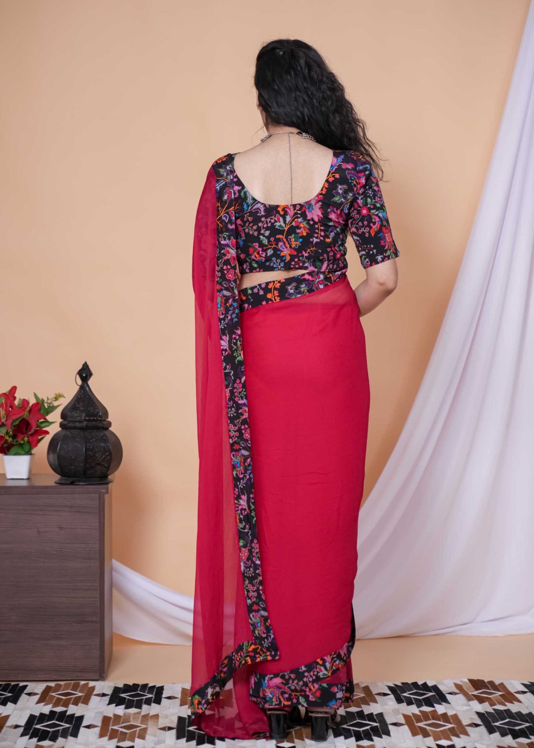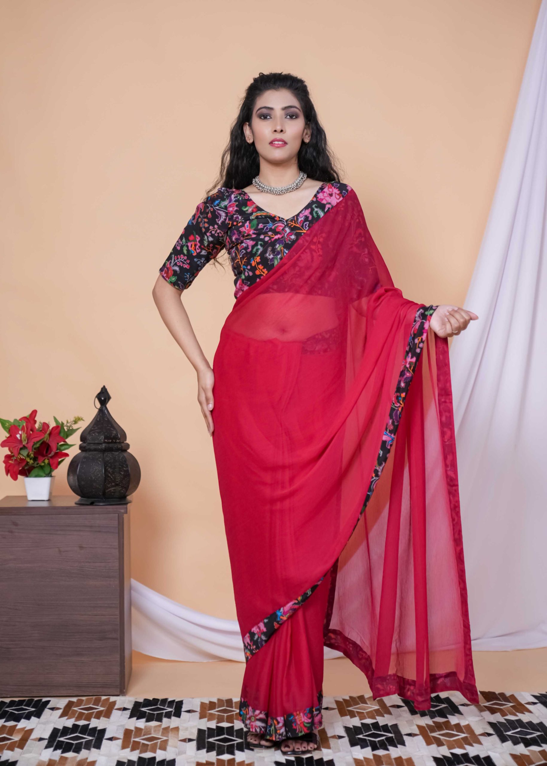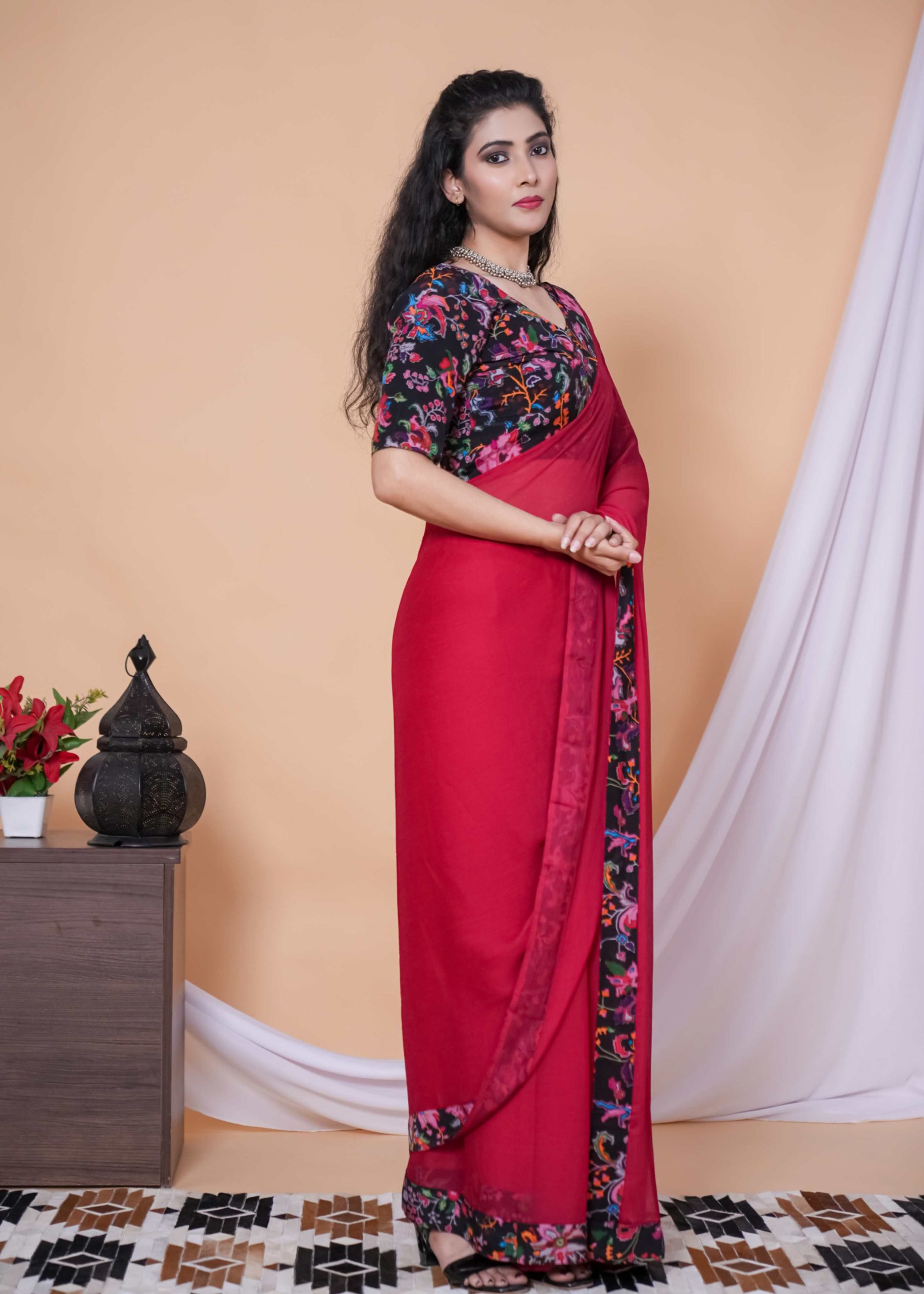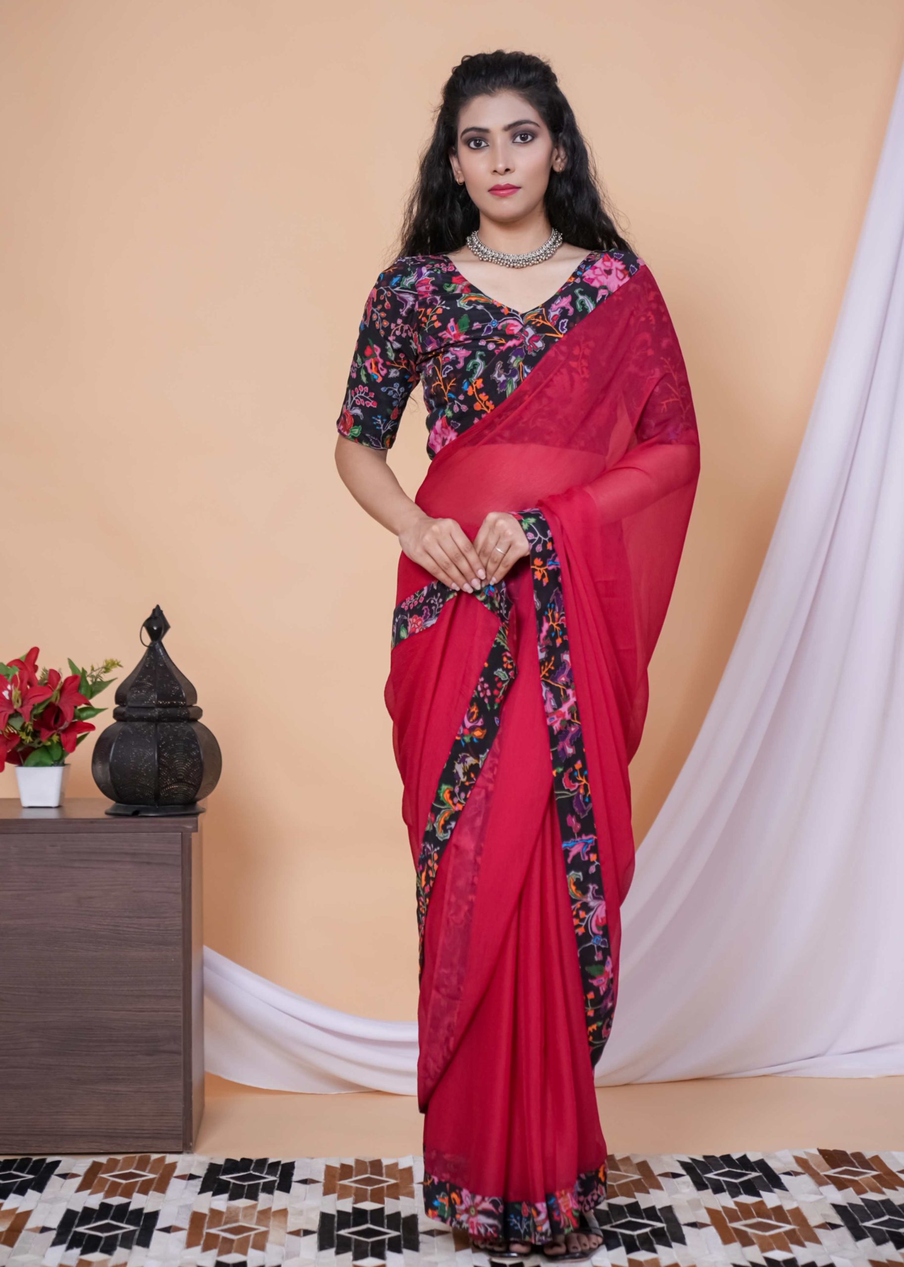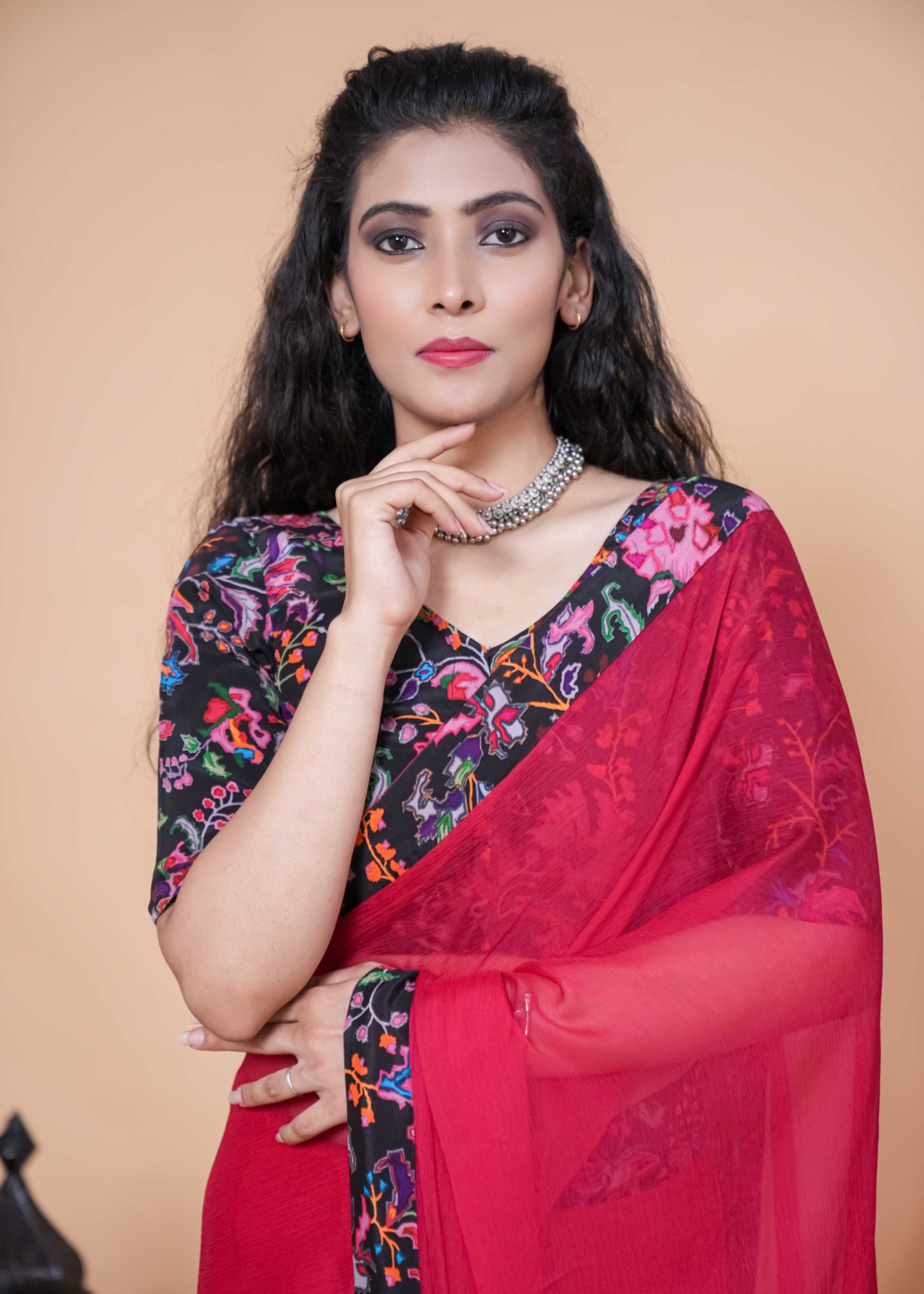 Our Red & Pink Shade Floral Chiffon Saree is the ultimate statement for brunch dates, haldi hugs, and every “wow” moment in between.
