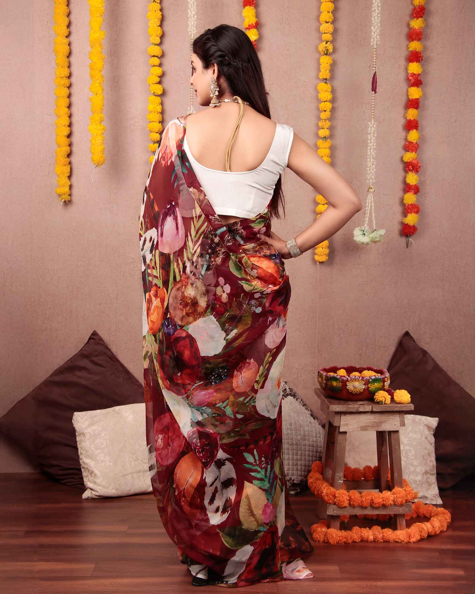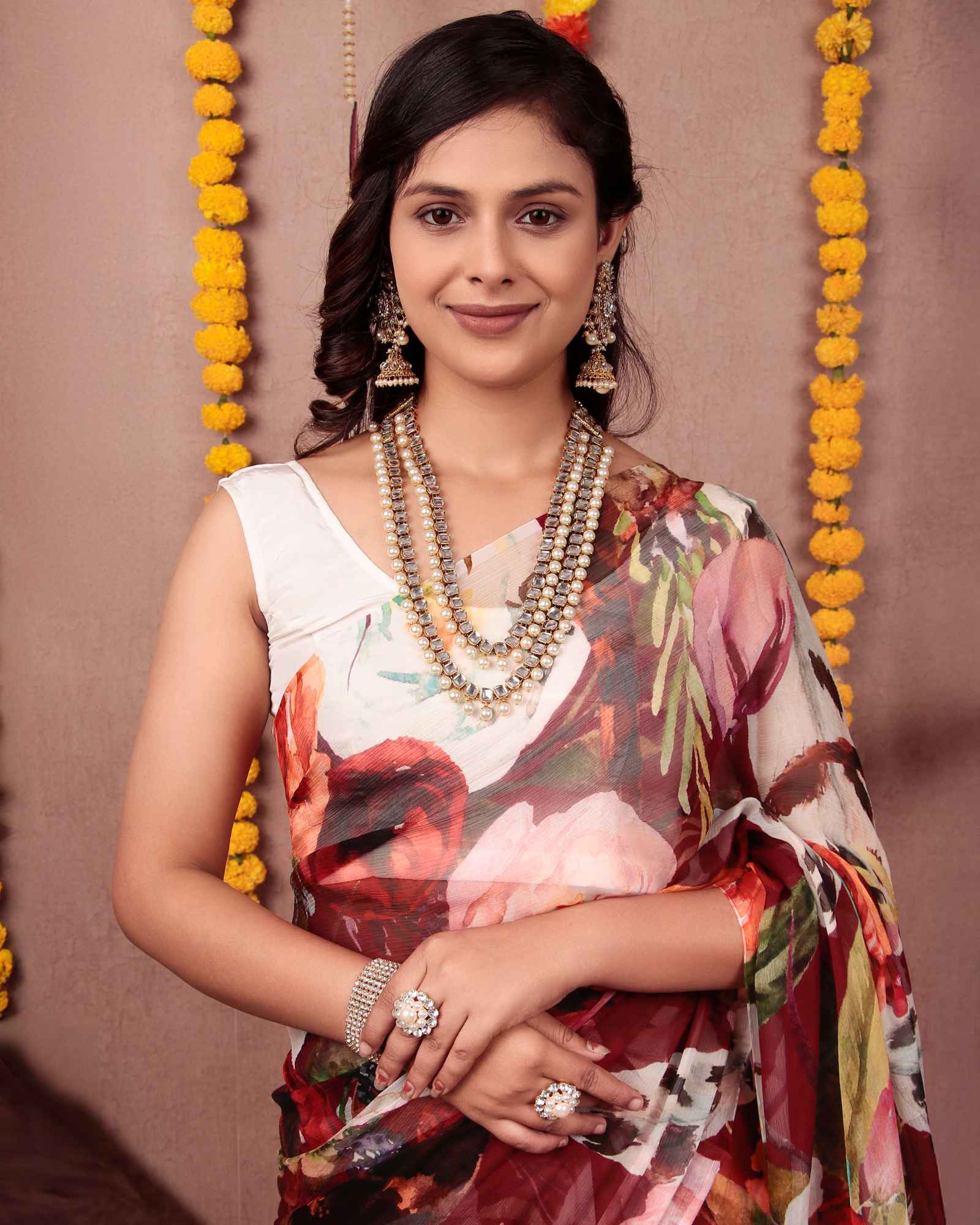 Our Red & Pink Shade Floral Chiffon Saree is the ultimate statement for brunch dates, haldi hugs, and every “wow” moment in between.